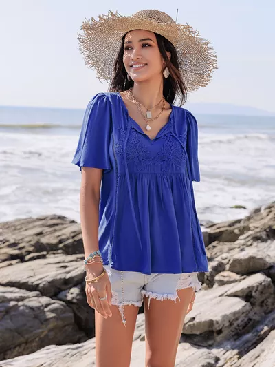 Lace Detail Tie Neck Short Sleeve Top
