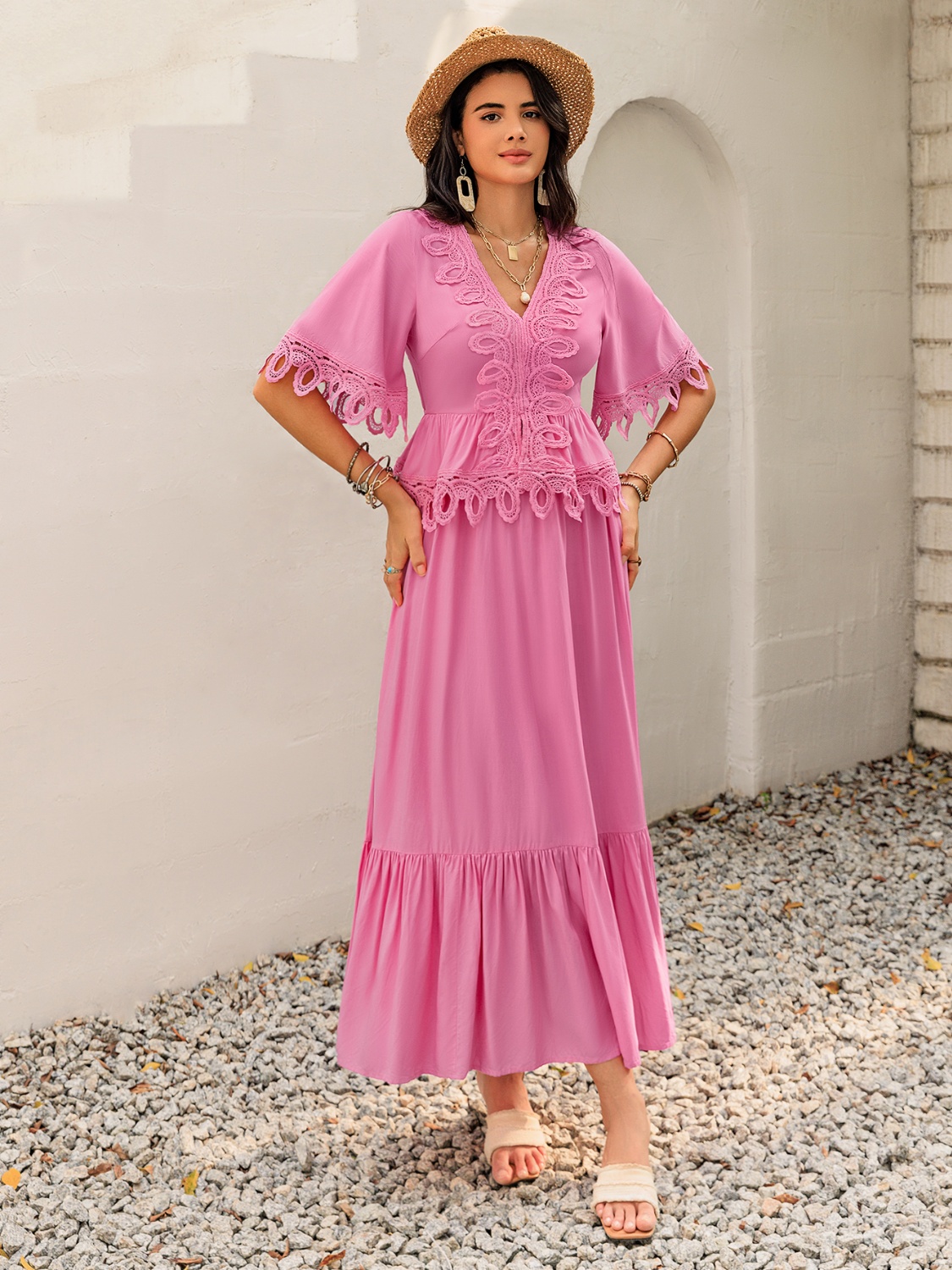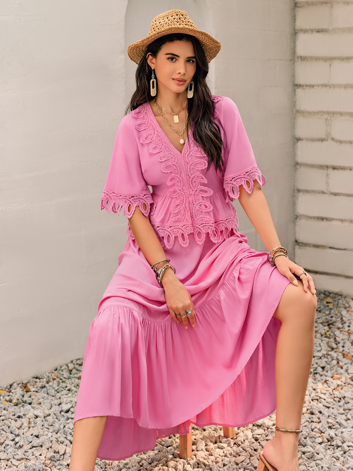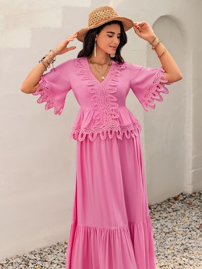 Lace Detail V-Neck Half Sleeve Midi Dress