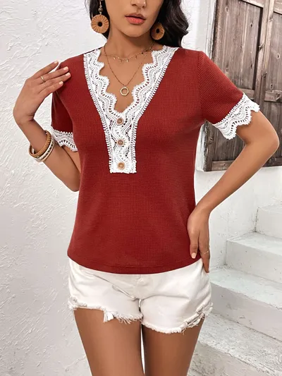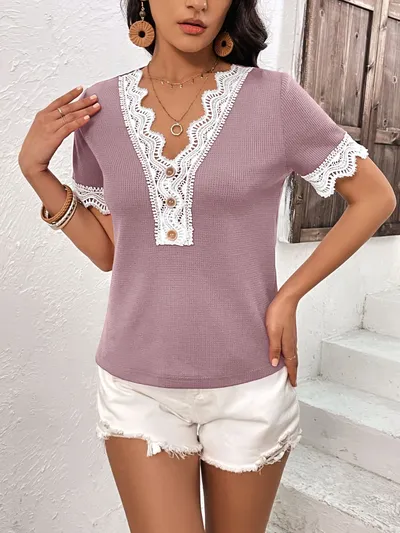 Lace Detail V-Neck Short Sleeve T-Shirt