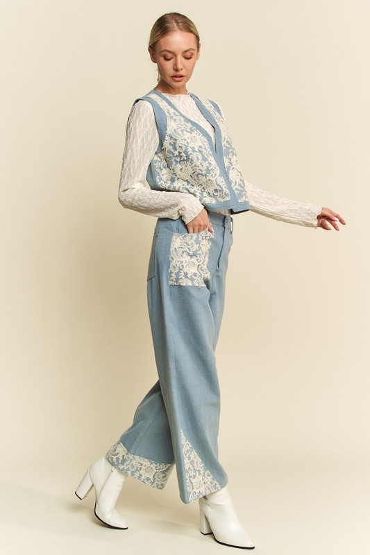 Lace Patch Open Front Denim Vest