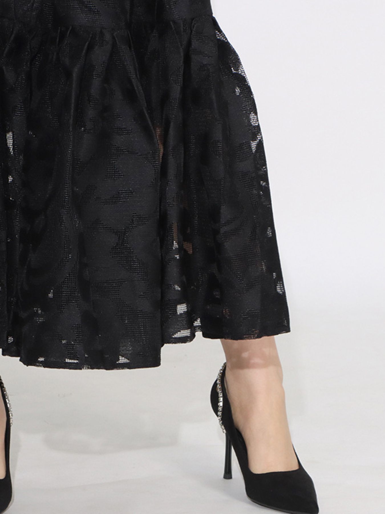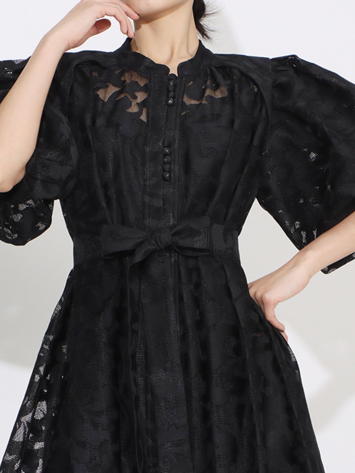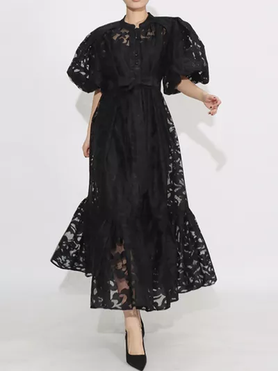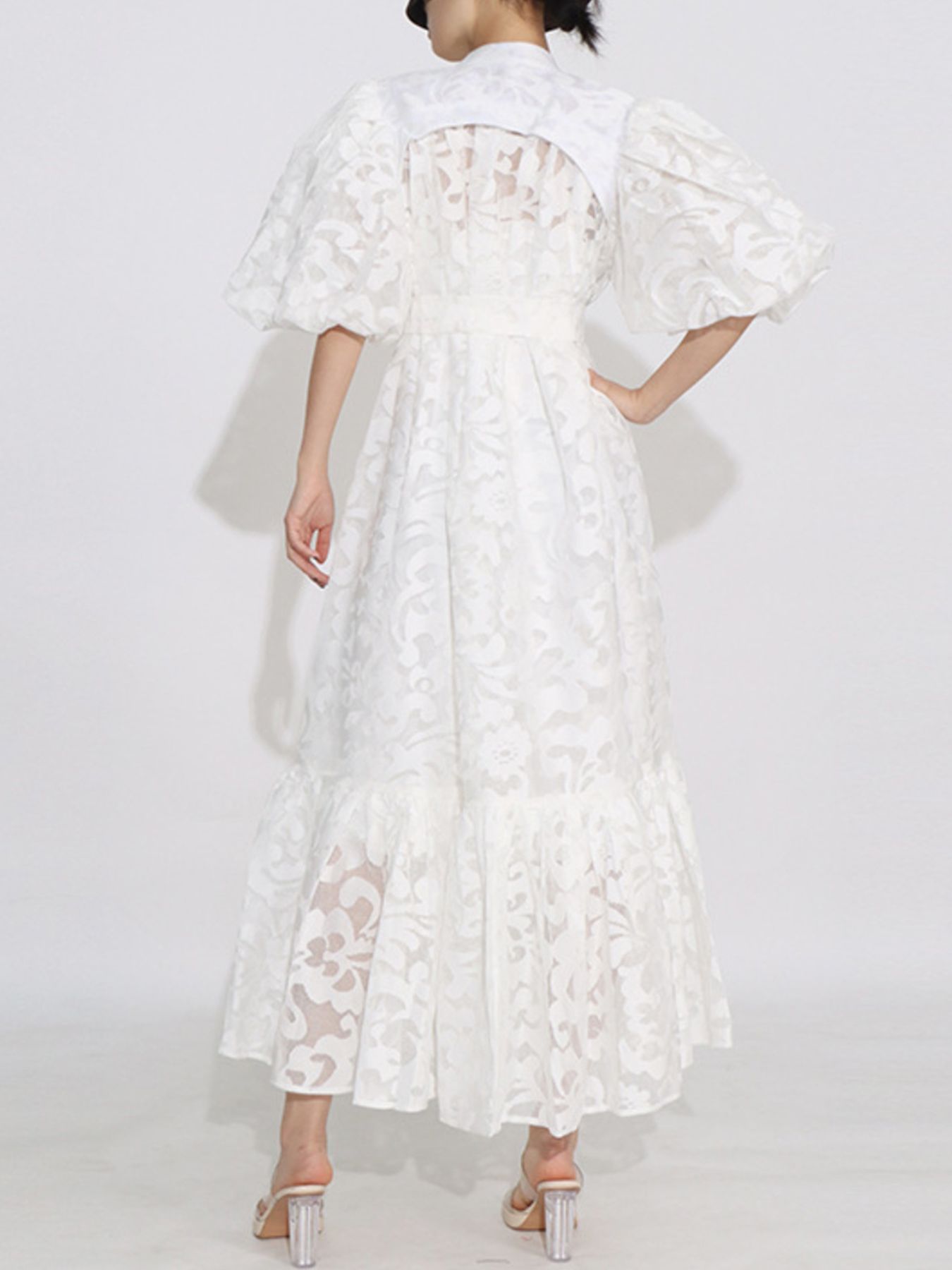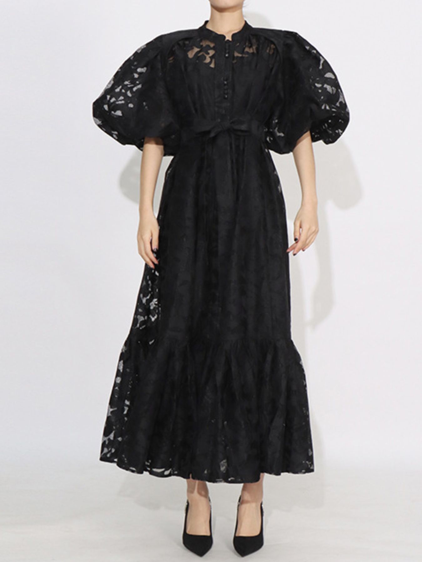 Lace Puff Sleeve Tie Waist Maxi Dress