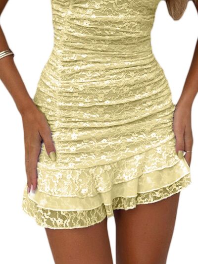 Lace Ruched Mini Cami Dress with Ruffled Hem