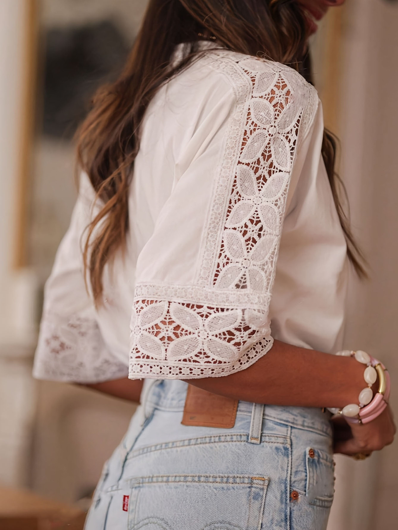 Lace Trim Round Neck Casual Blouse