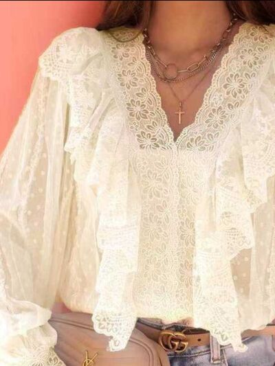 Lace Trim Ruffle V-Neck Long Sleeve Blouse