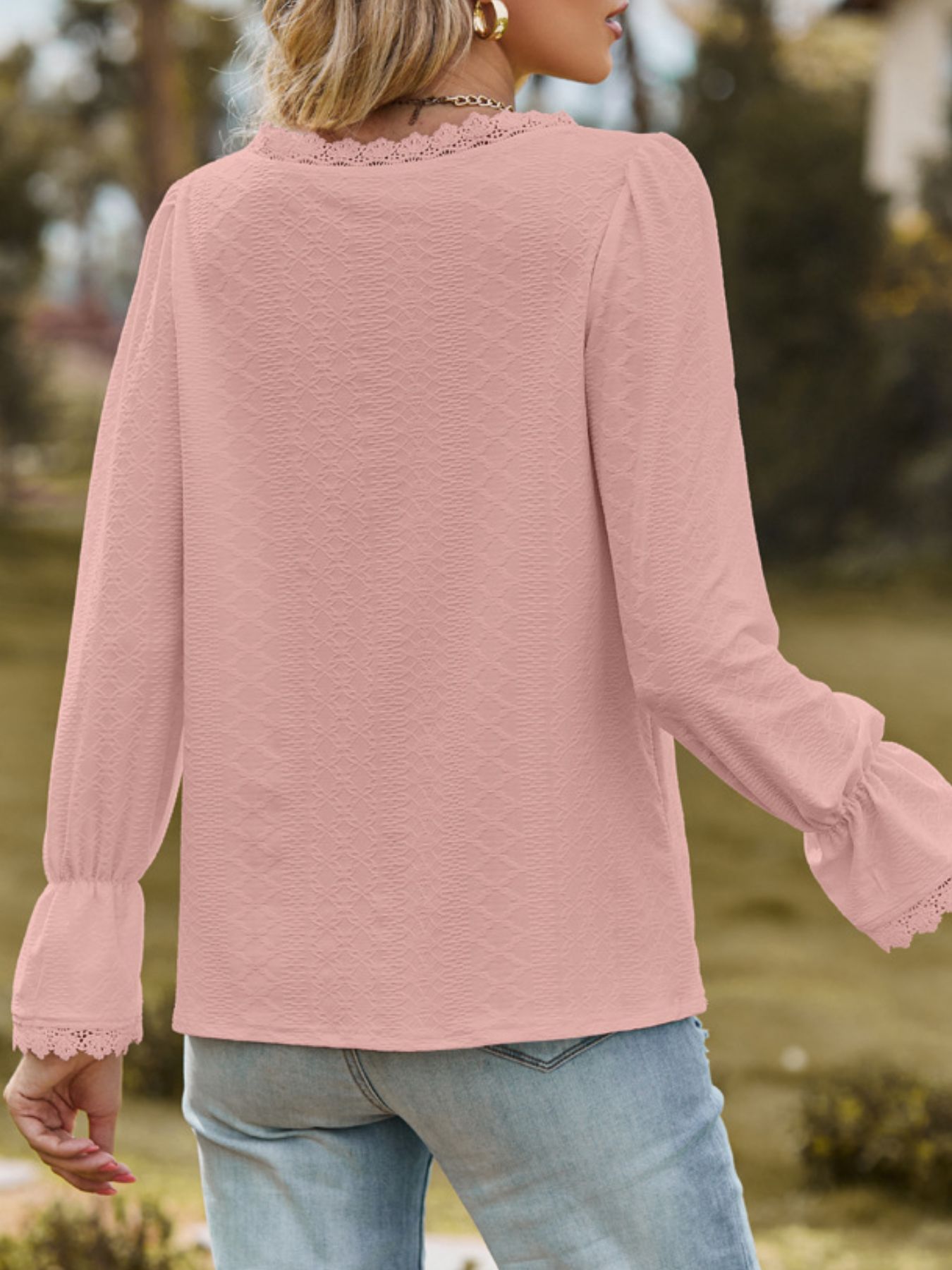 Lace Trim V-Neck Blouse with Flounce Sleeves
