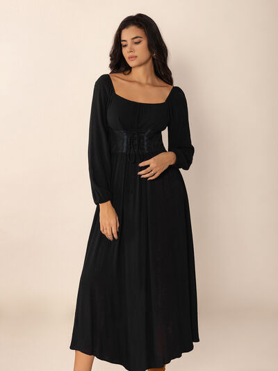 Lace-Up Square Neck Long Sleeve Midi Dress