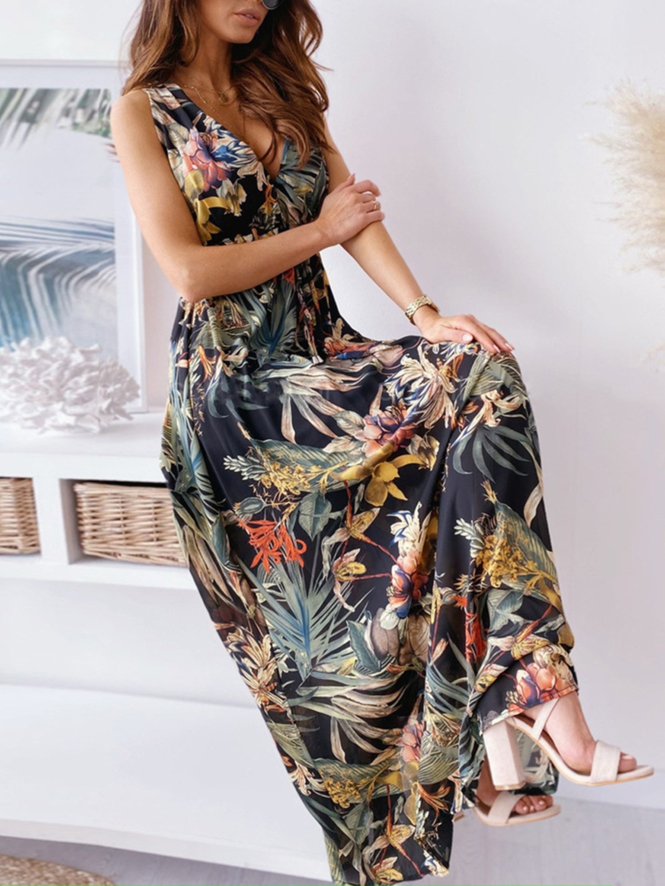 Leaf Print Sleeveless Maxi Dress