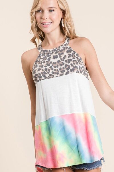 Leopard and Tie Dye Block Halter Neck Top