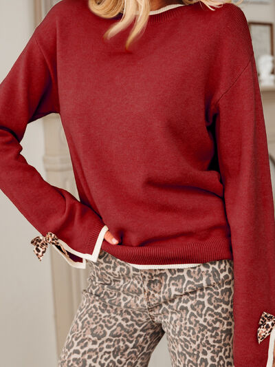 Leopard Bow Decor Split Cuff Contrast Trim Sweater
