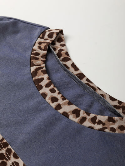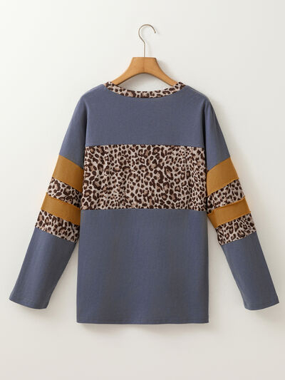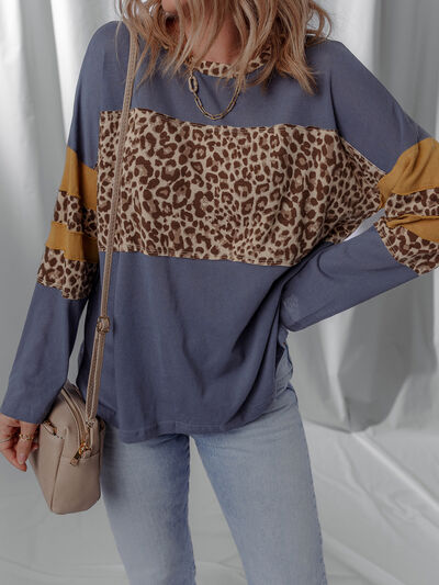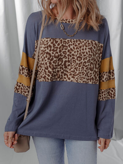 Leopard Color Block Long Sleeve Drop Shoulder Top