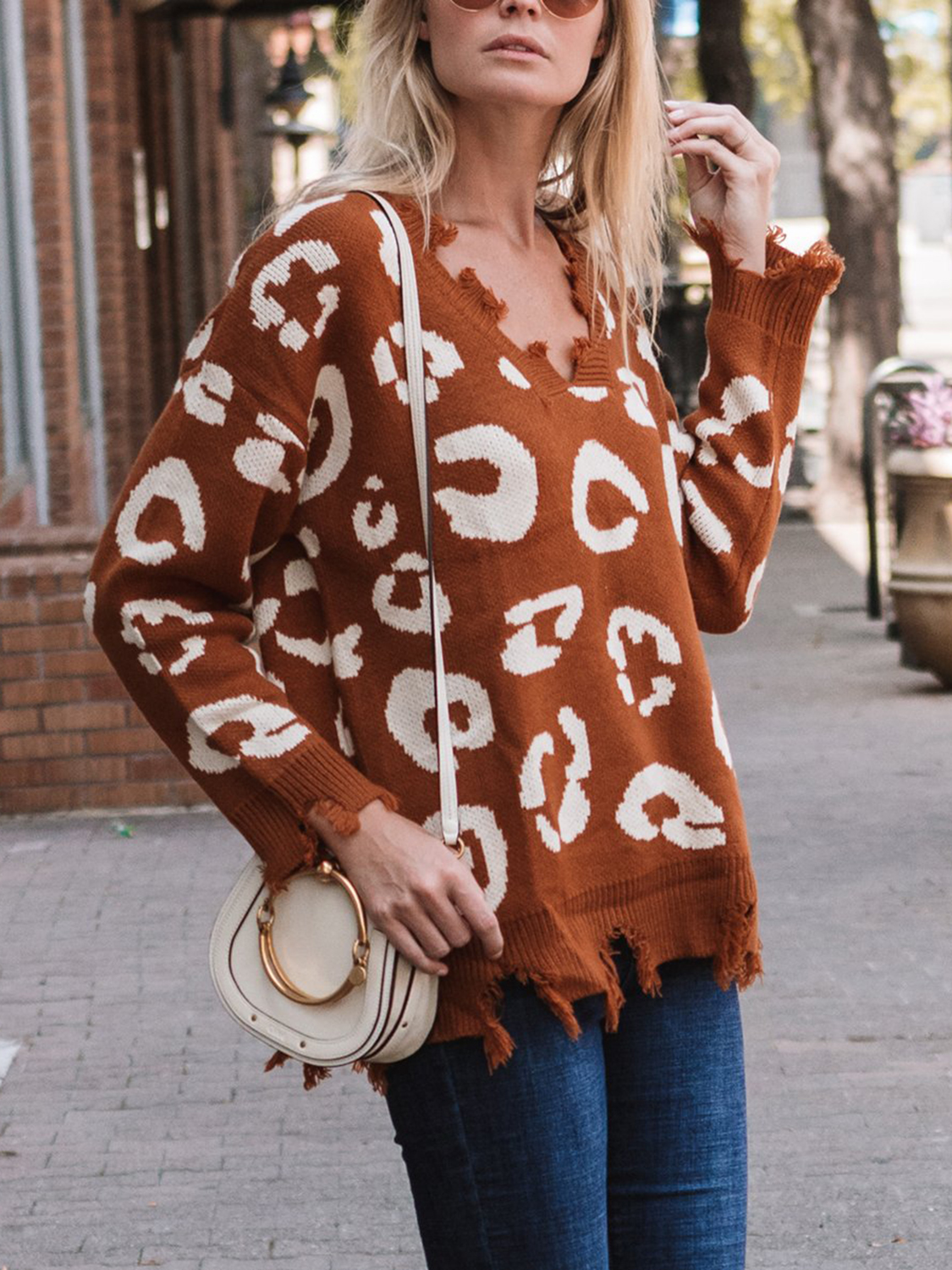 Leopard Frayed Hem Long Sleeve Sweater