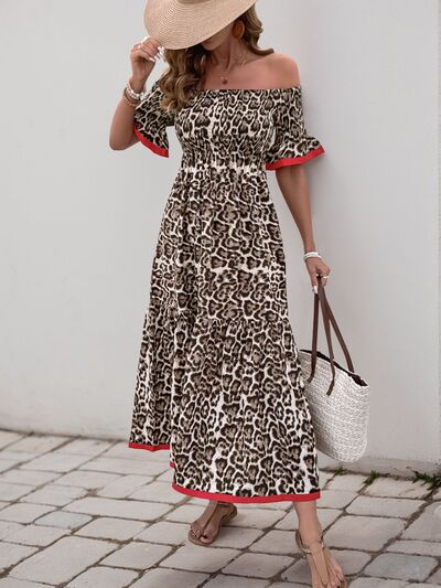 Leopard Off-Shoulder Flounce Sleeve Midi Dress