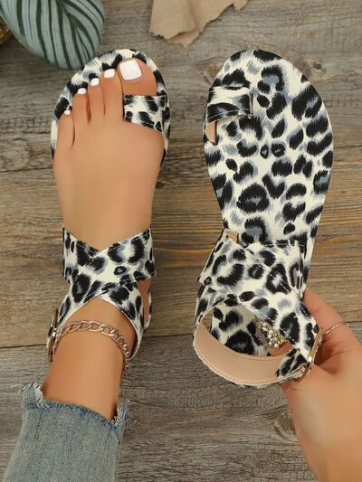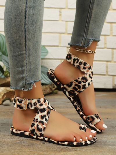 Leopard Print Ankle Strap Flat Sandals