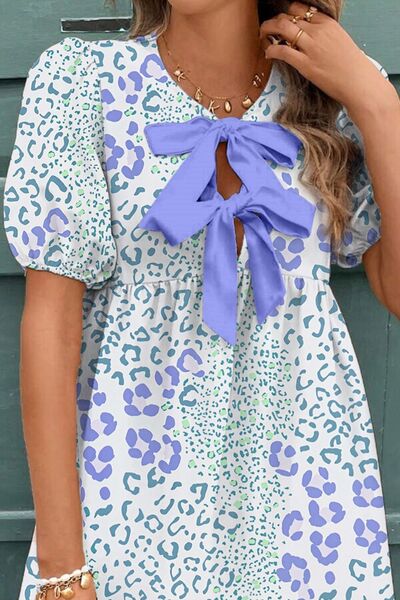 Leopard Print Bow Front Puff Sleeve Mini Dress