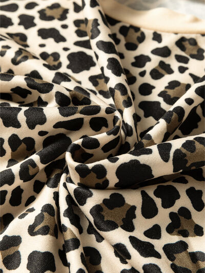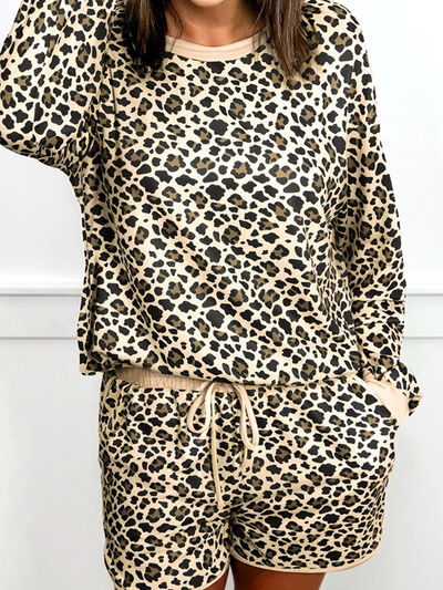 Leopard Print Contrast Trim Long Sleeve Pullover and Drawstring Shorts 2pcs Outfit