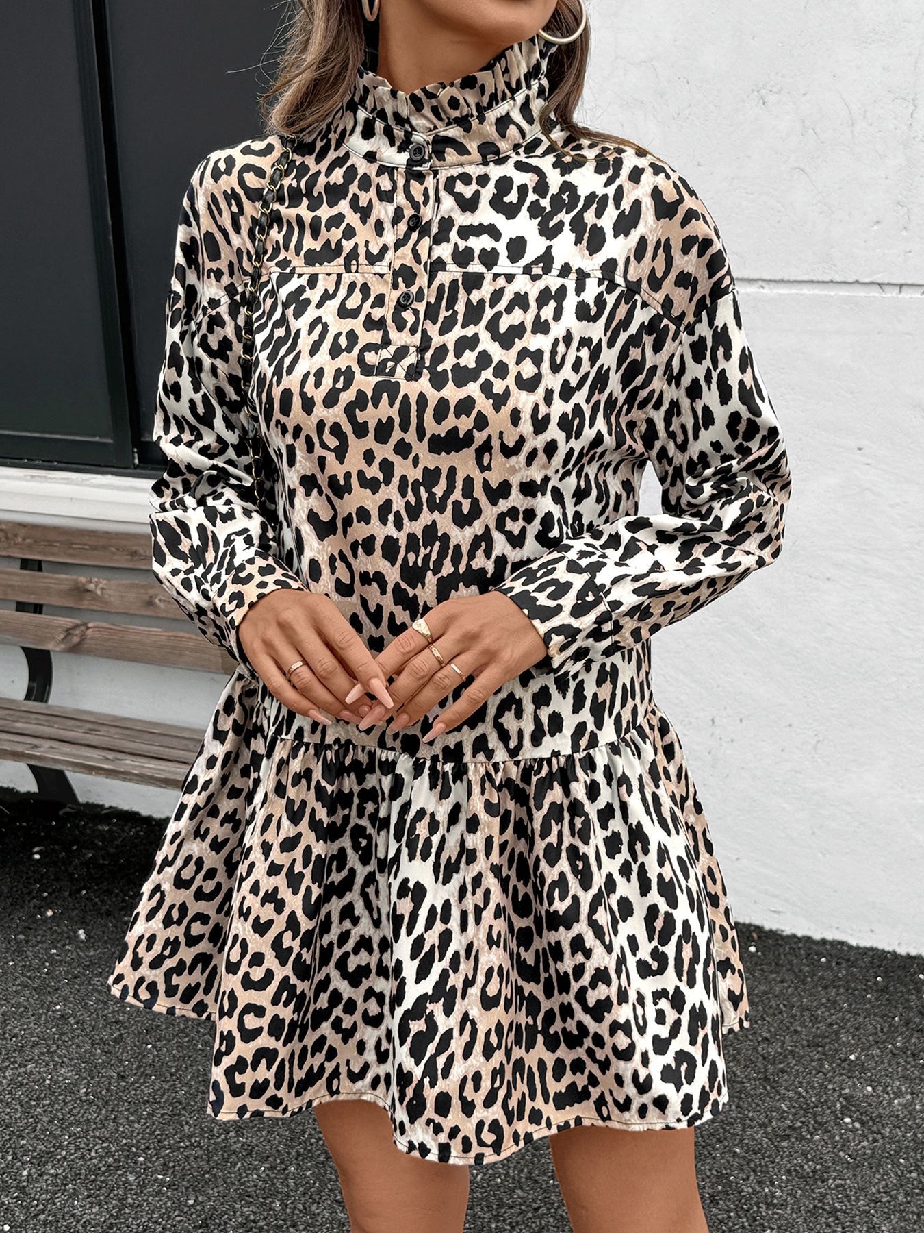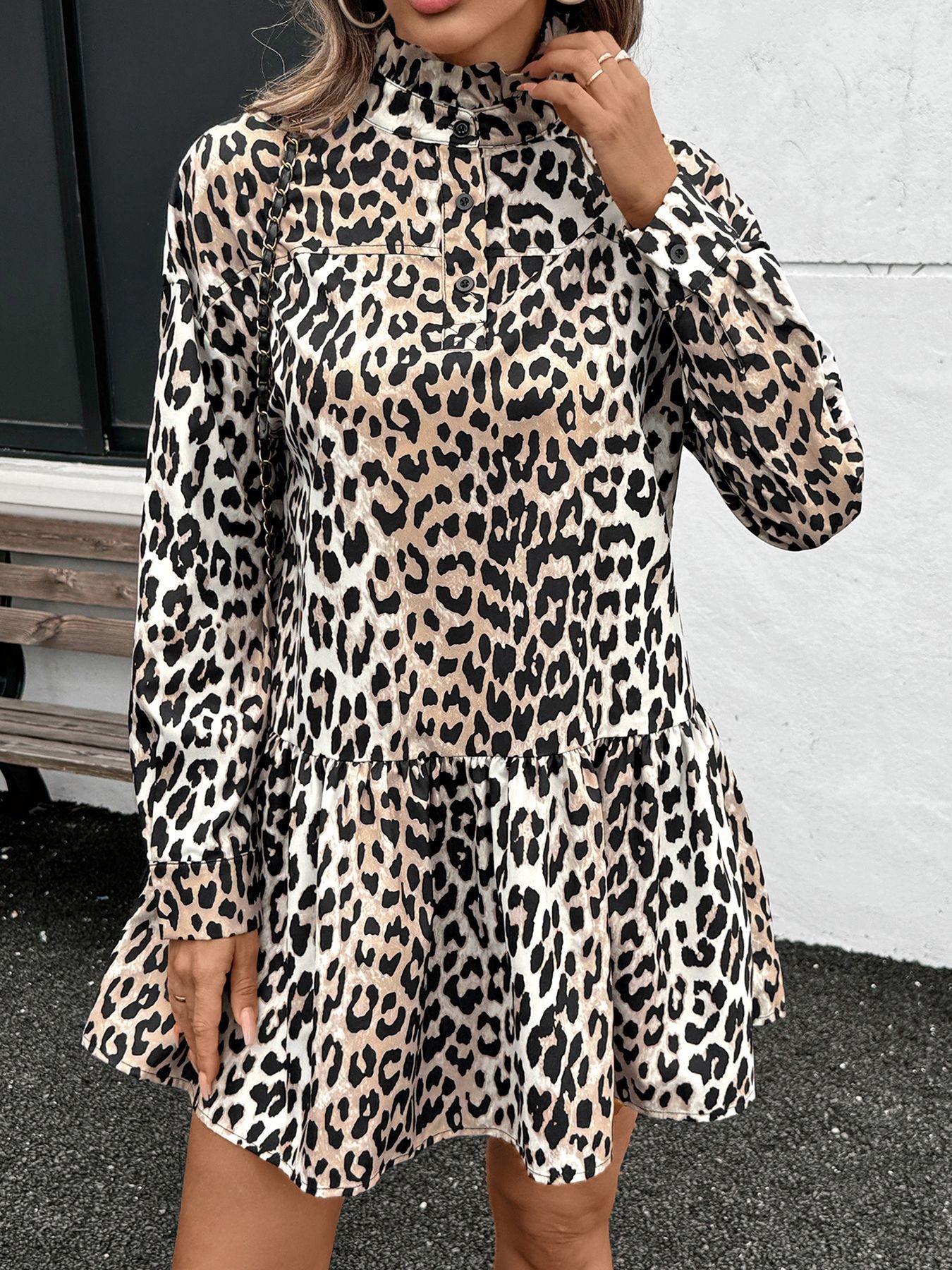 Leopard Print Long Sleeve Mock Neck Mini Dress