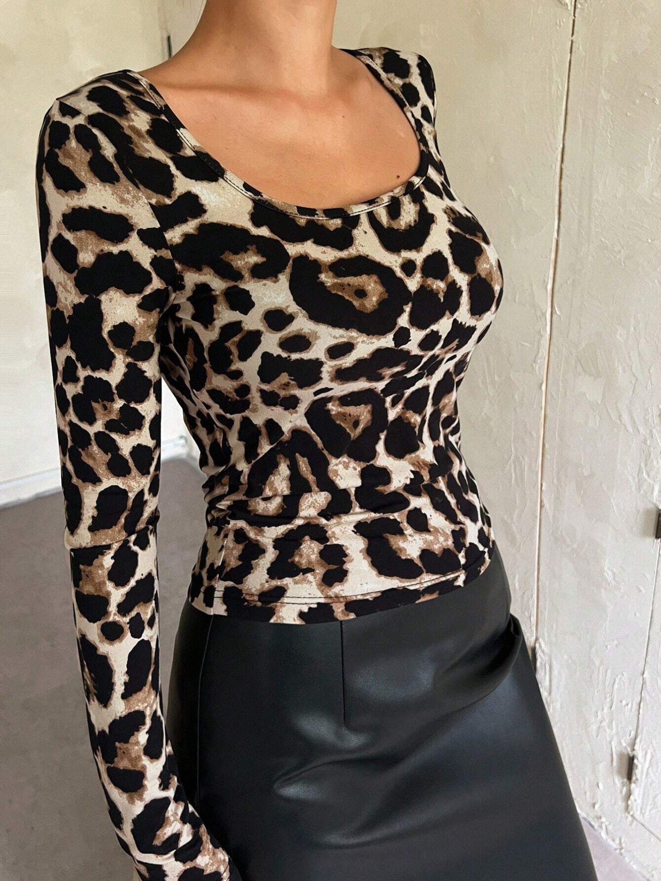 Leopard Print Square Neck Long Sleeve Top