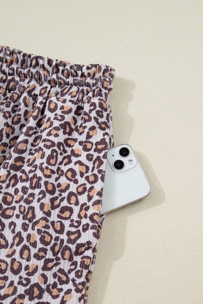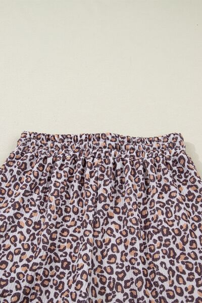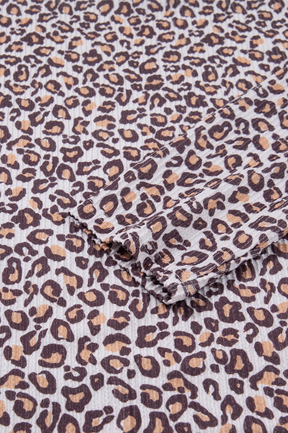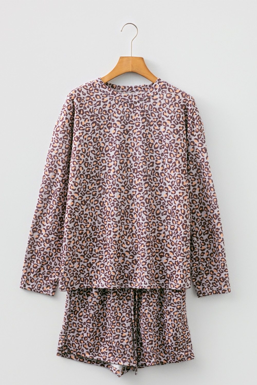 Leopard Ribbed Long Sleeve Top Drawstring Shorts 2pcs Outfit