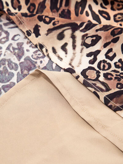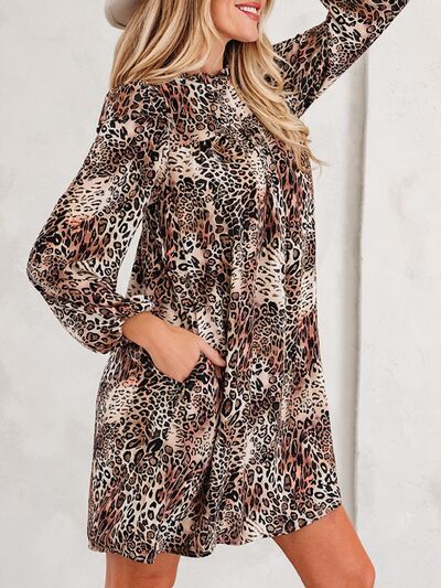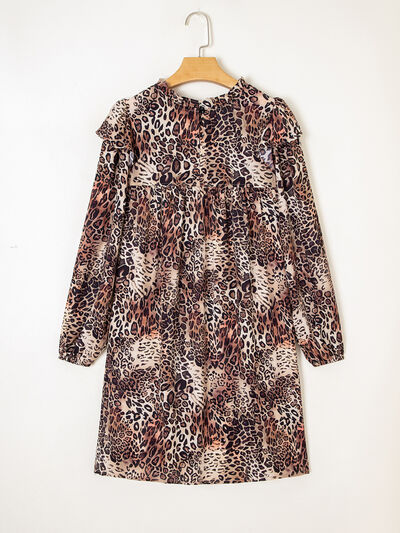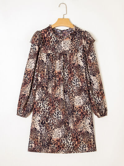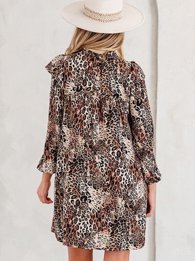 Leopard Ruffled Detail Long Sleeve Loose Mini Dress