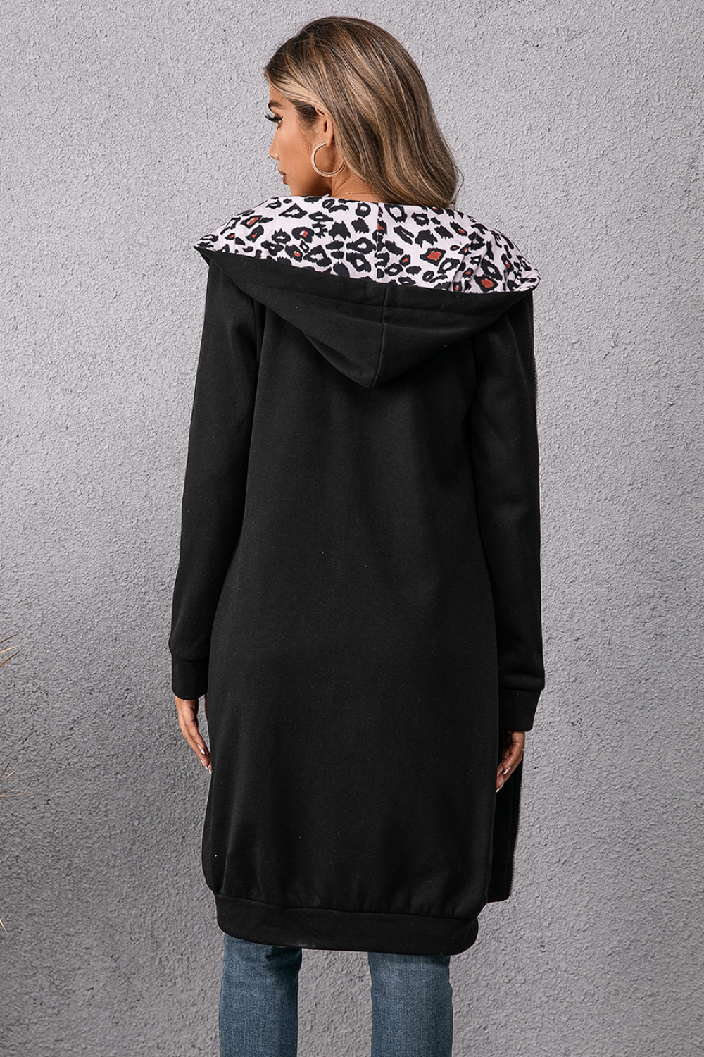 Leopard Spliced Drawstring Zip Up Hoodie Dress
