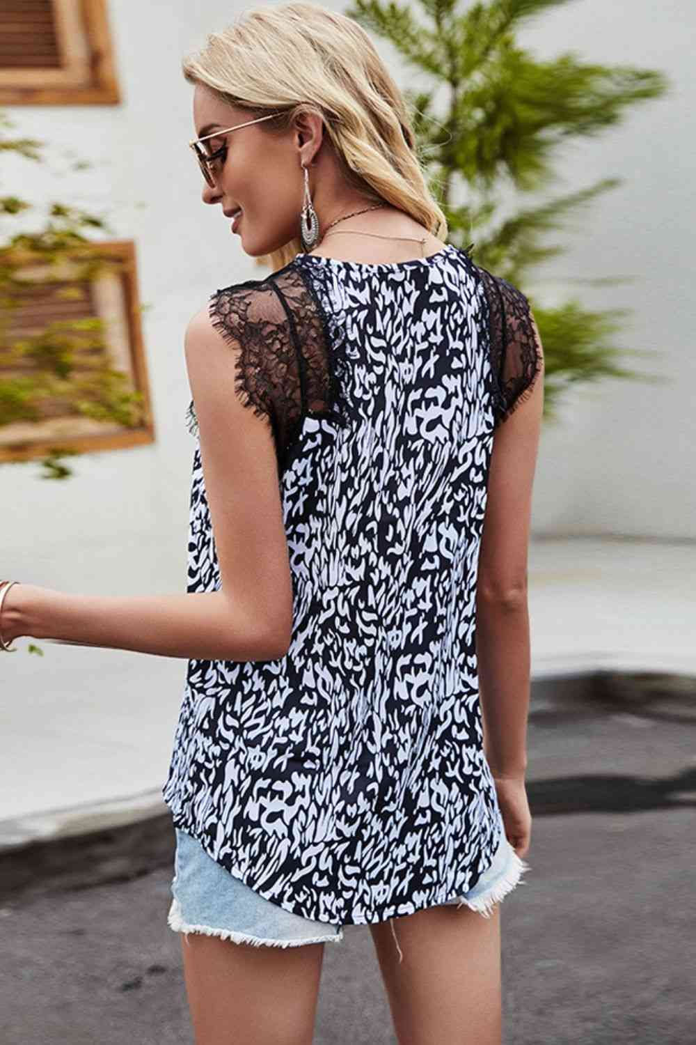 Leopard Spliced Lace Scalloped Tank