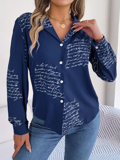 Letter Printed Button Up Long Sleeve Blouse