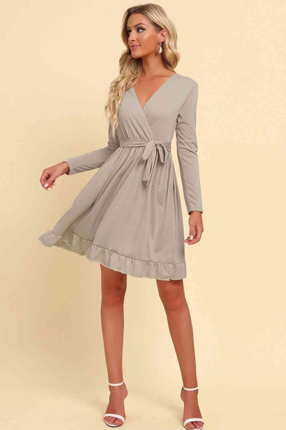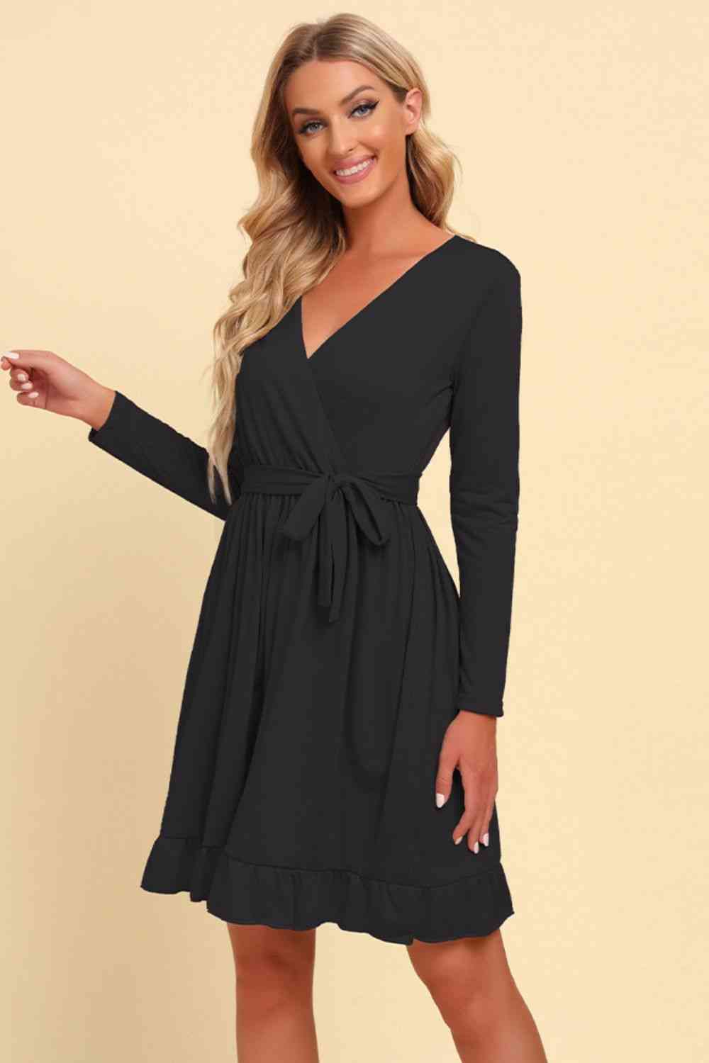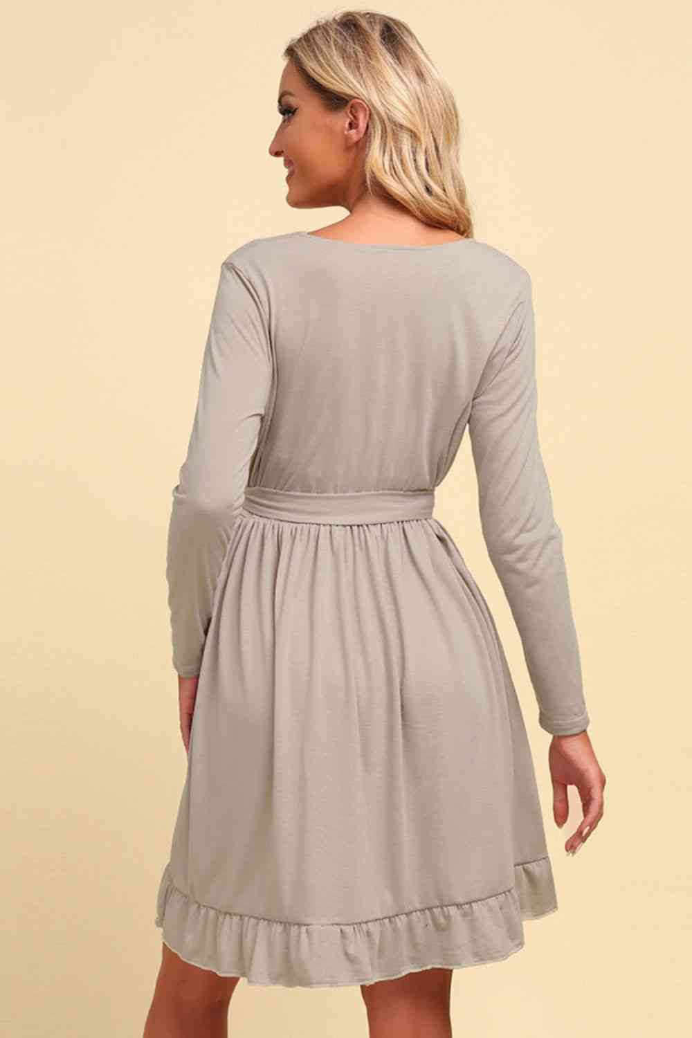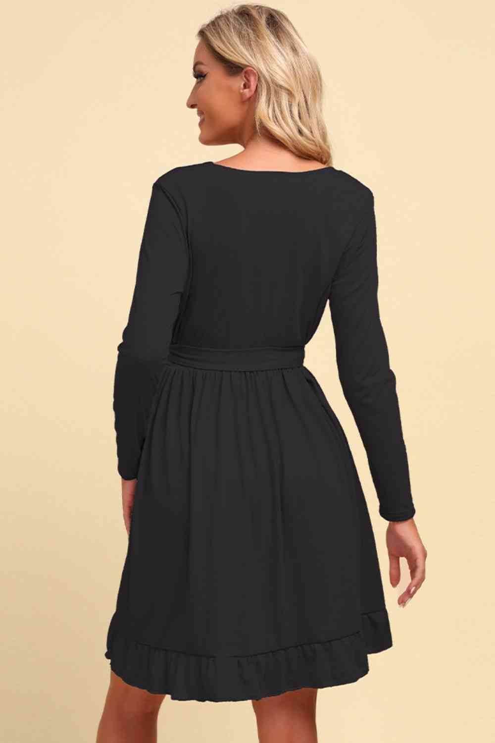 Long Sleeve Tie Waist Ruffle Hem Dress