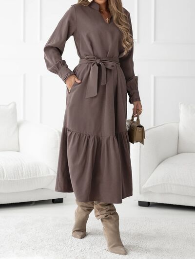 Long Sleeve Tie Waist Ruffle Hem Midi Dress