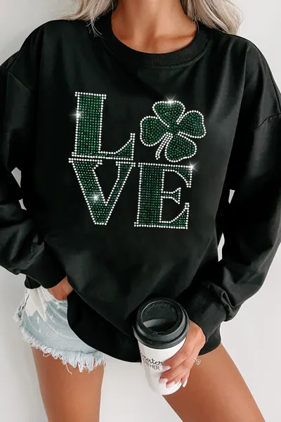 LOVE Rhinestone Clover Round Neck Sweatshirt