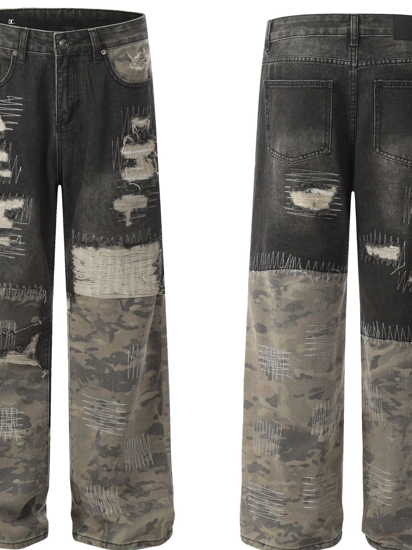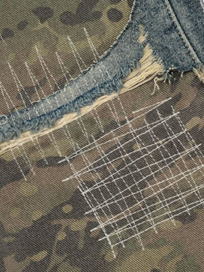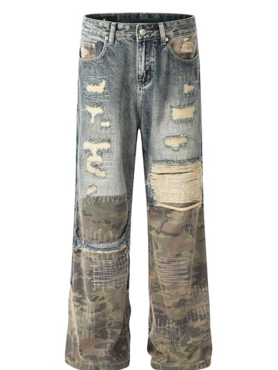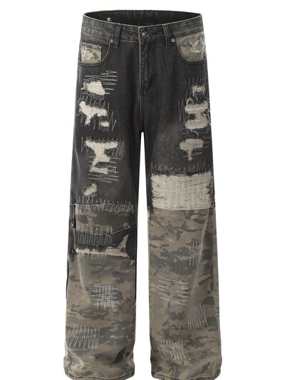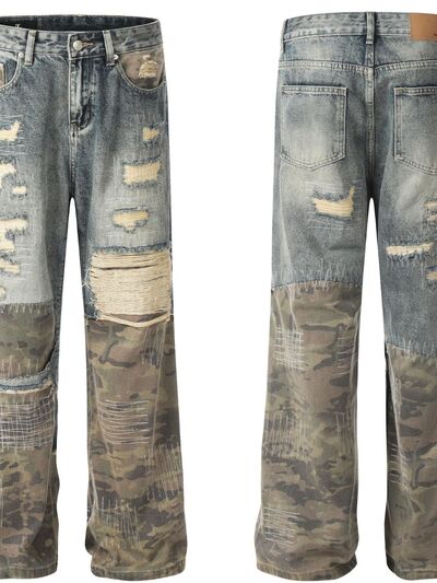 Men's Distressed Camouflage Patchwork Jeans