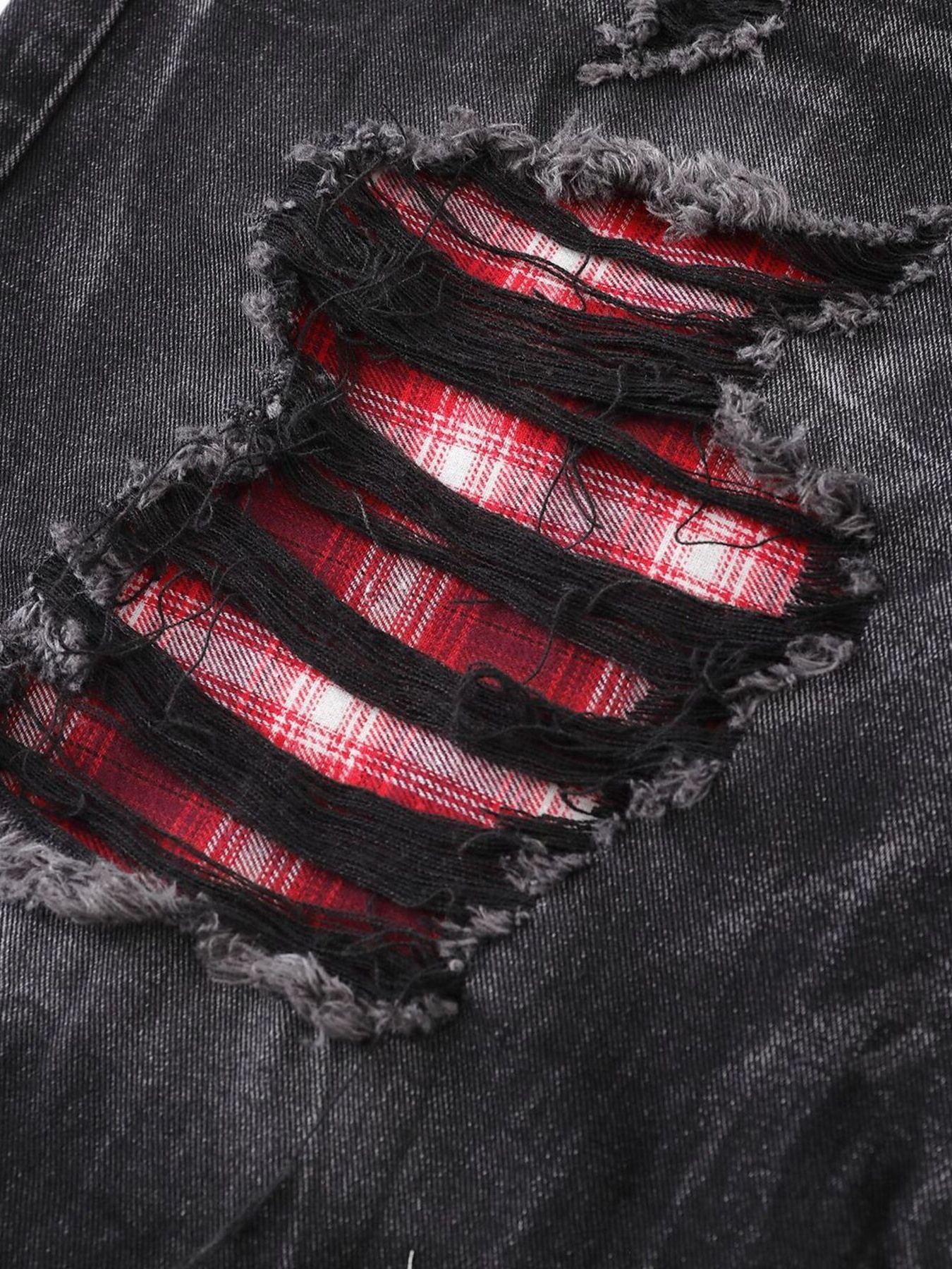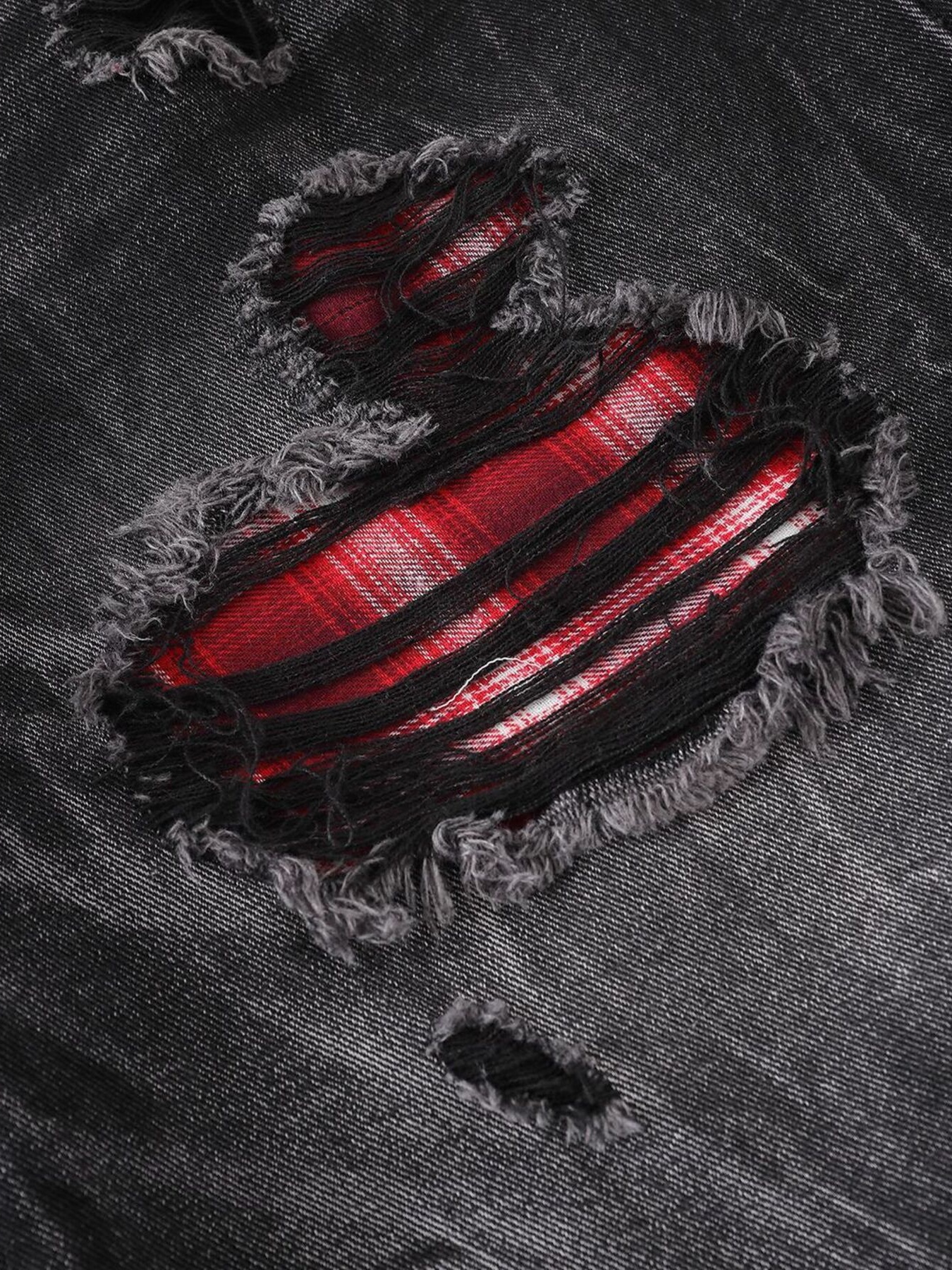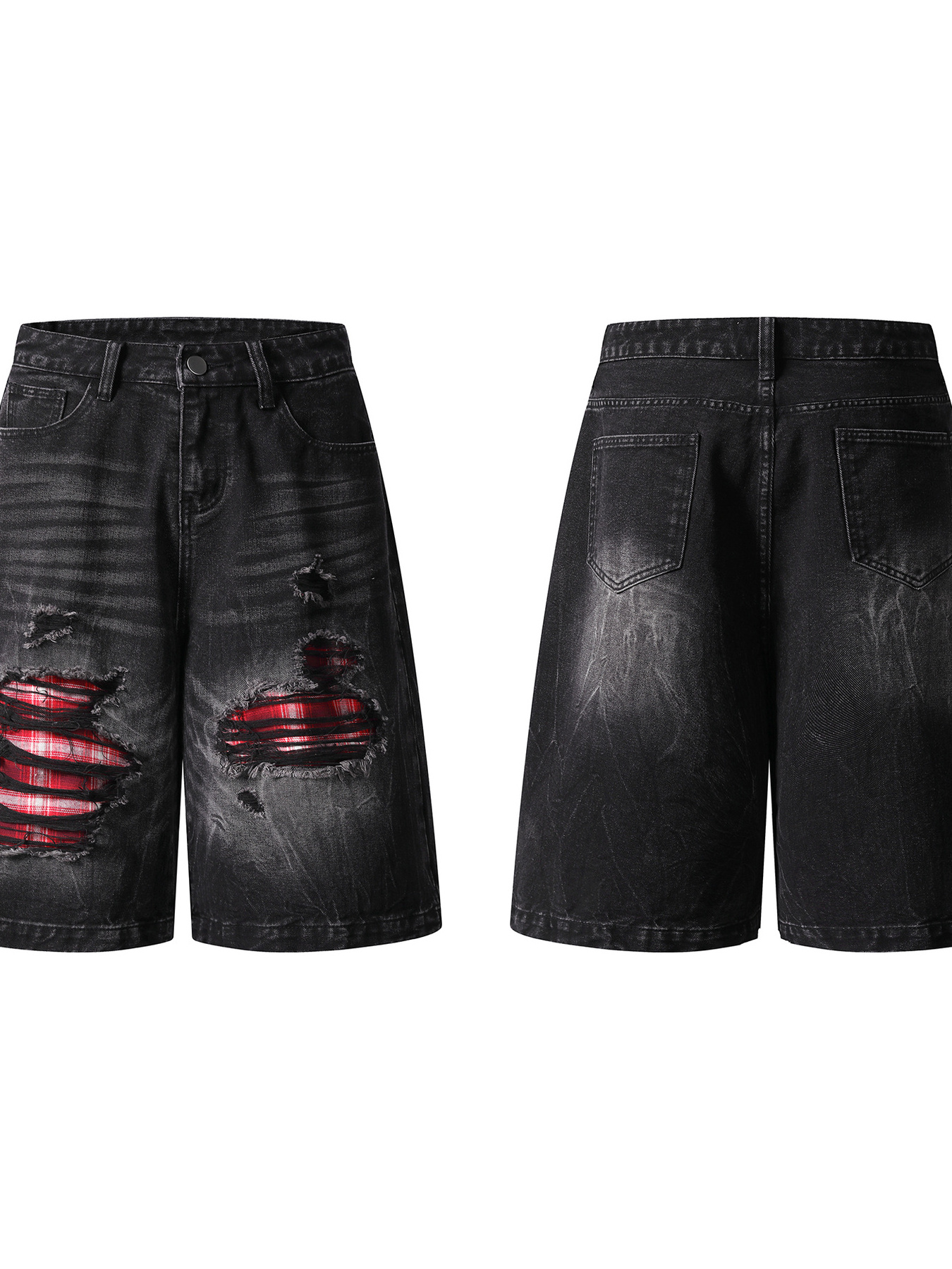 Men's Distressed Denim Shorts with Plaid Patches