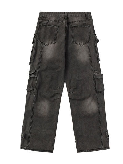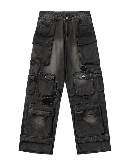 Men's Distressed Washed Cargo Jeans with Multi-Pockets