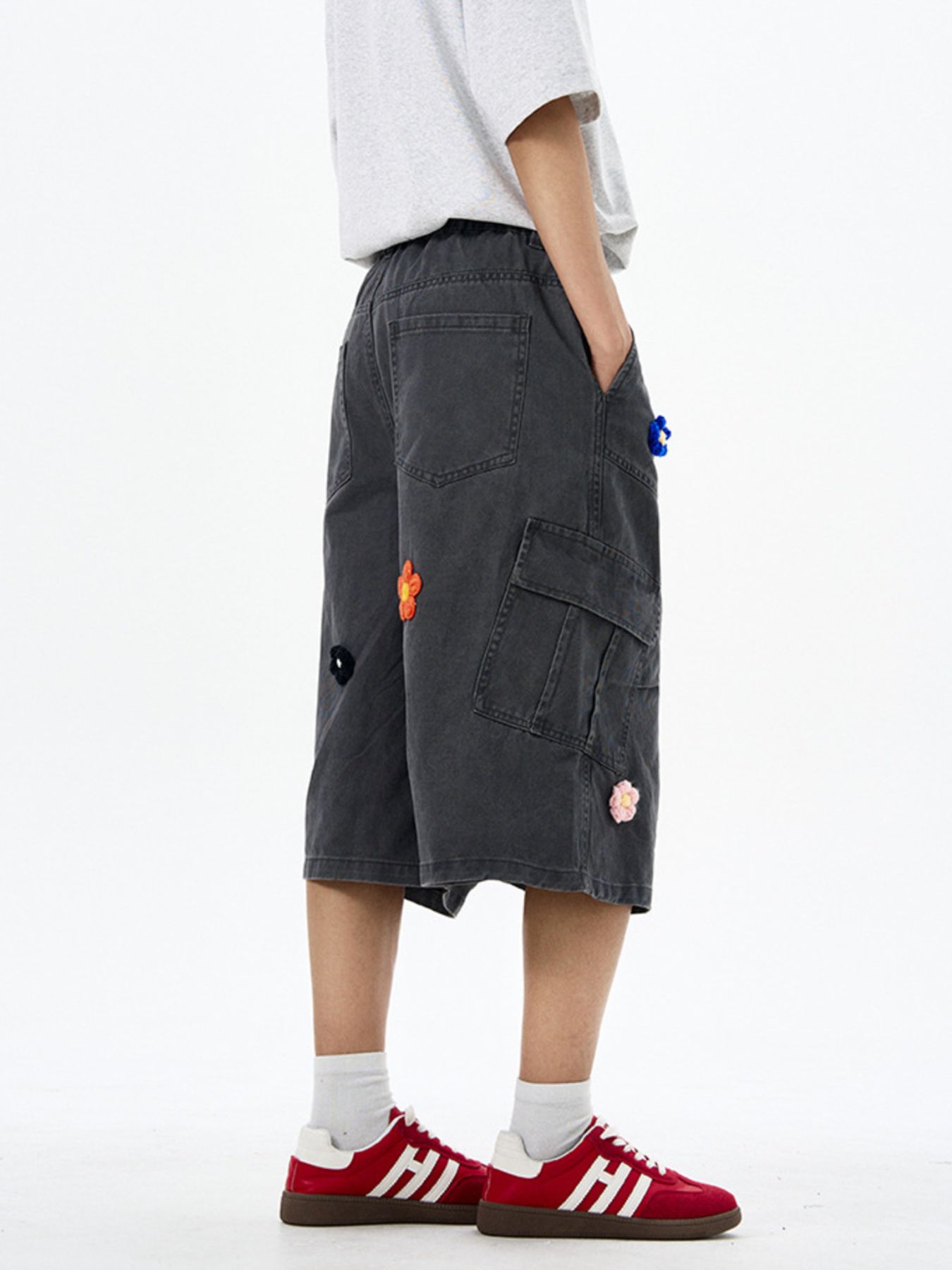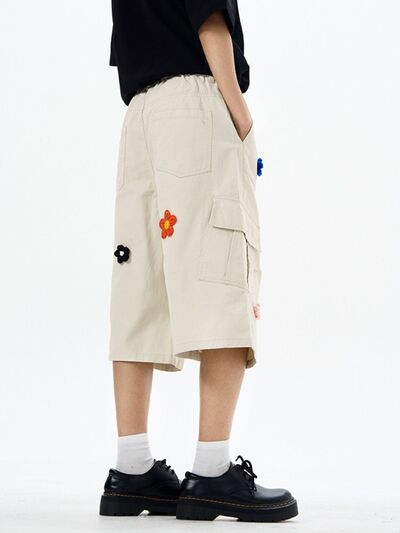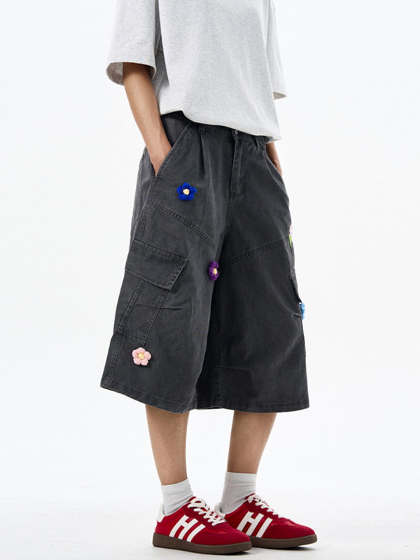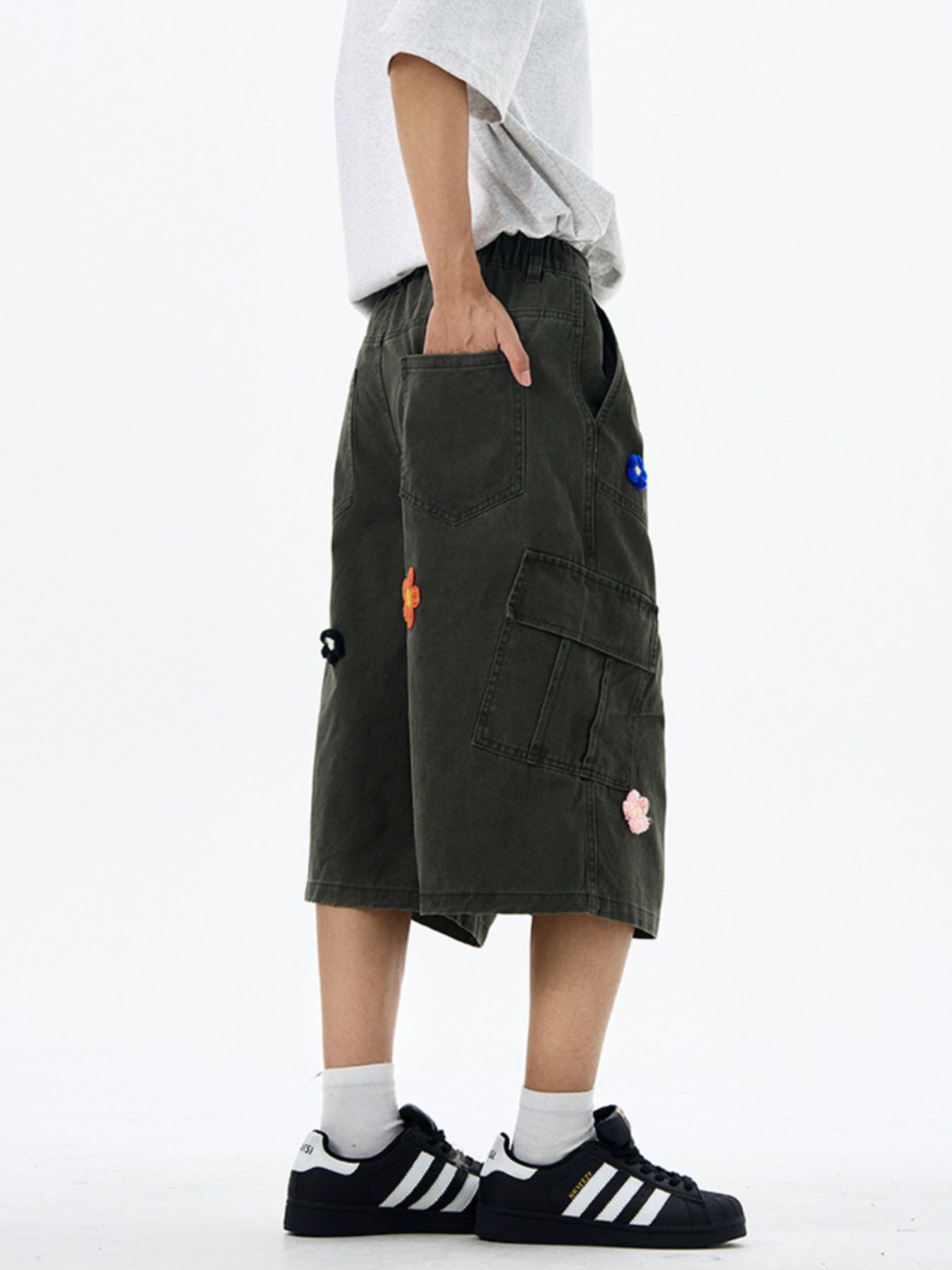 Men's Floral Appliqued Wide-Leg Cargo Shorts