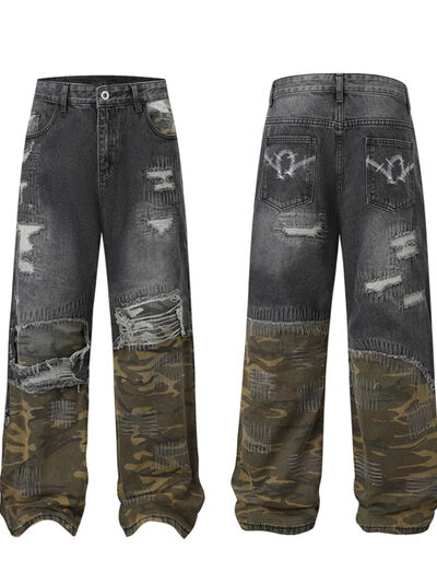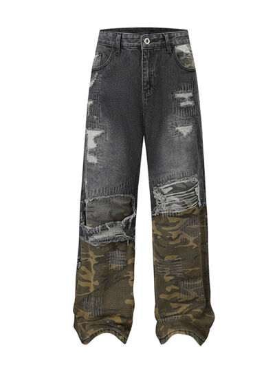 Men's Full Size Distressed Denim Jeans with Camo Patchwork Detailing Plus Size