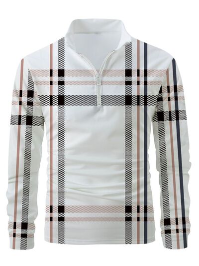 Men's Full Size Plaid Zip Collar Long Sleeve Polo Plus Size
