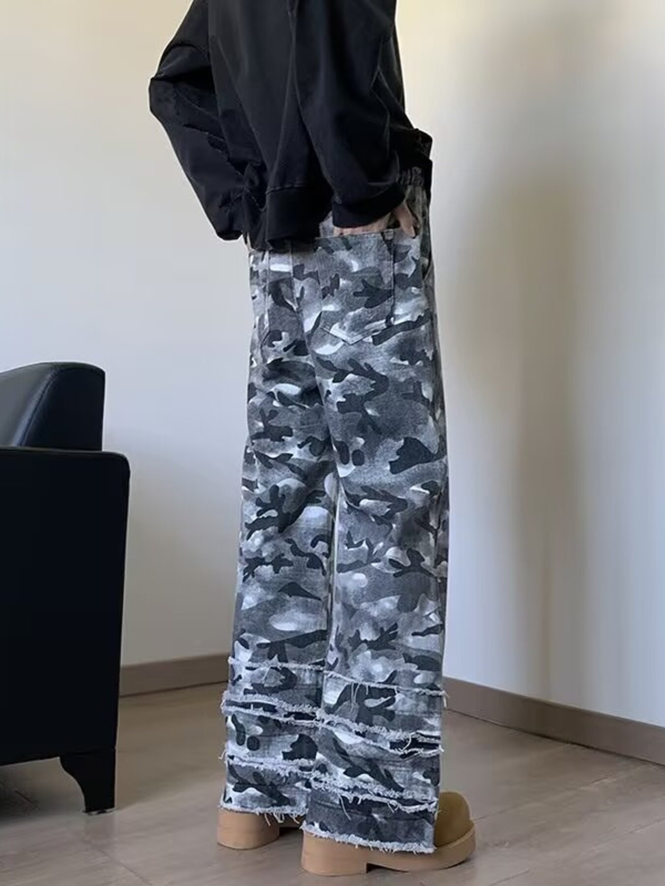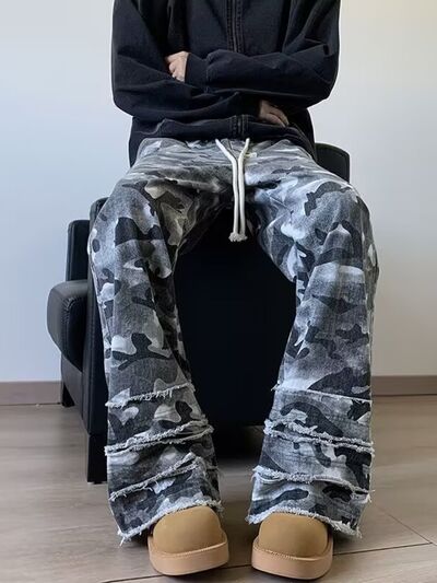 Men's Full Size Raw Hem Camo Wide Leg Jeans Plus Size