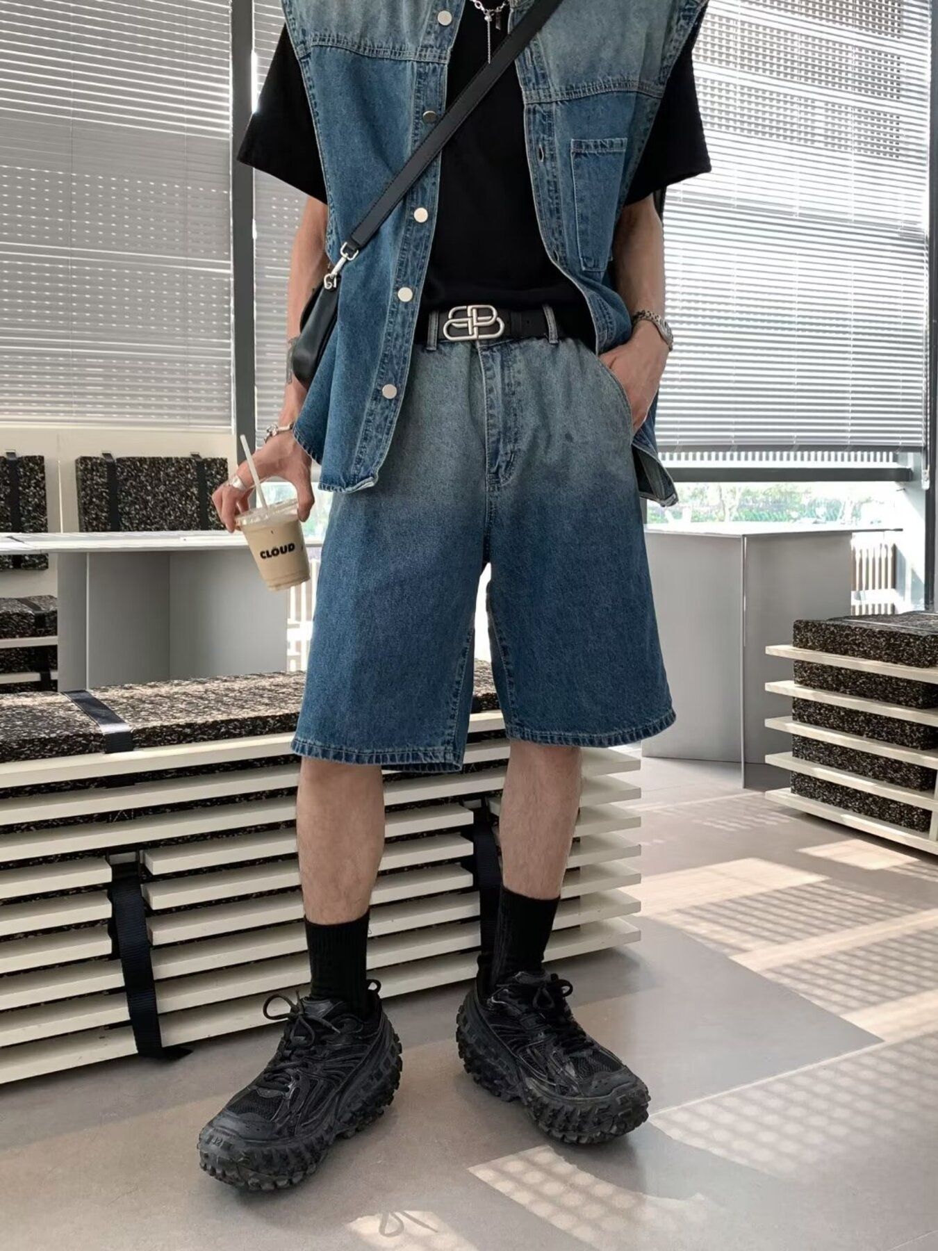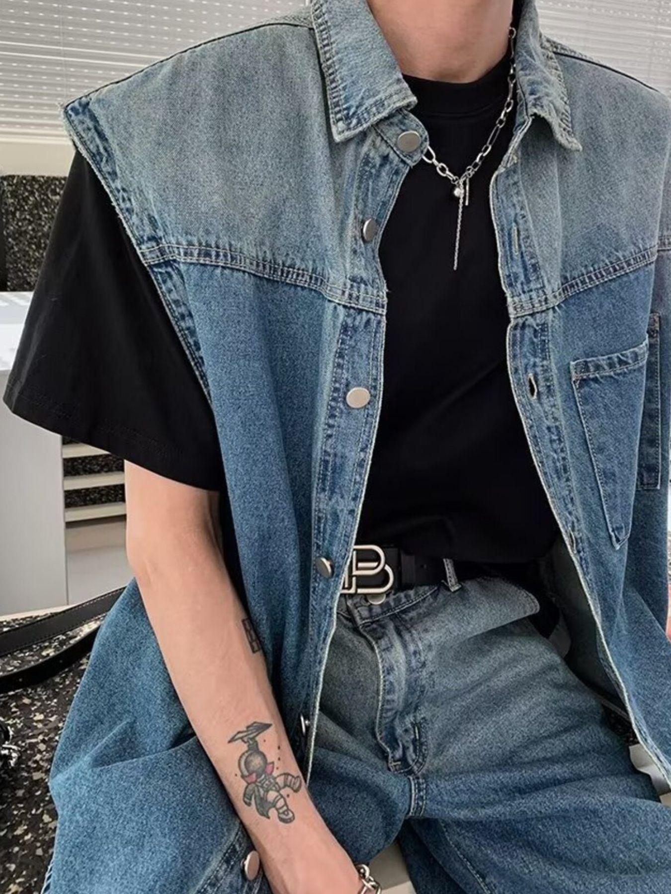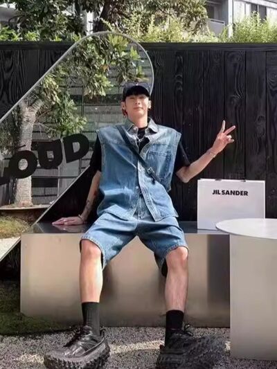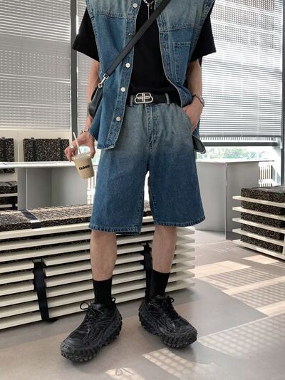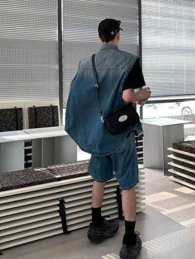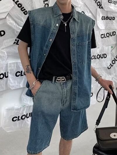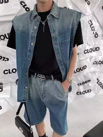 Men's Plus Size Button Up Vest and Shorts Denim Set