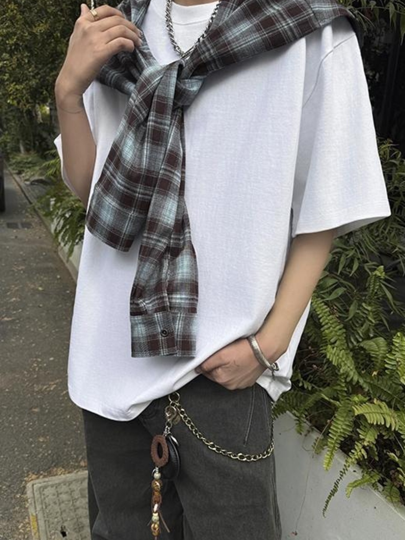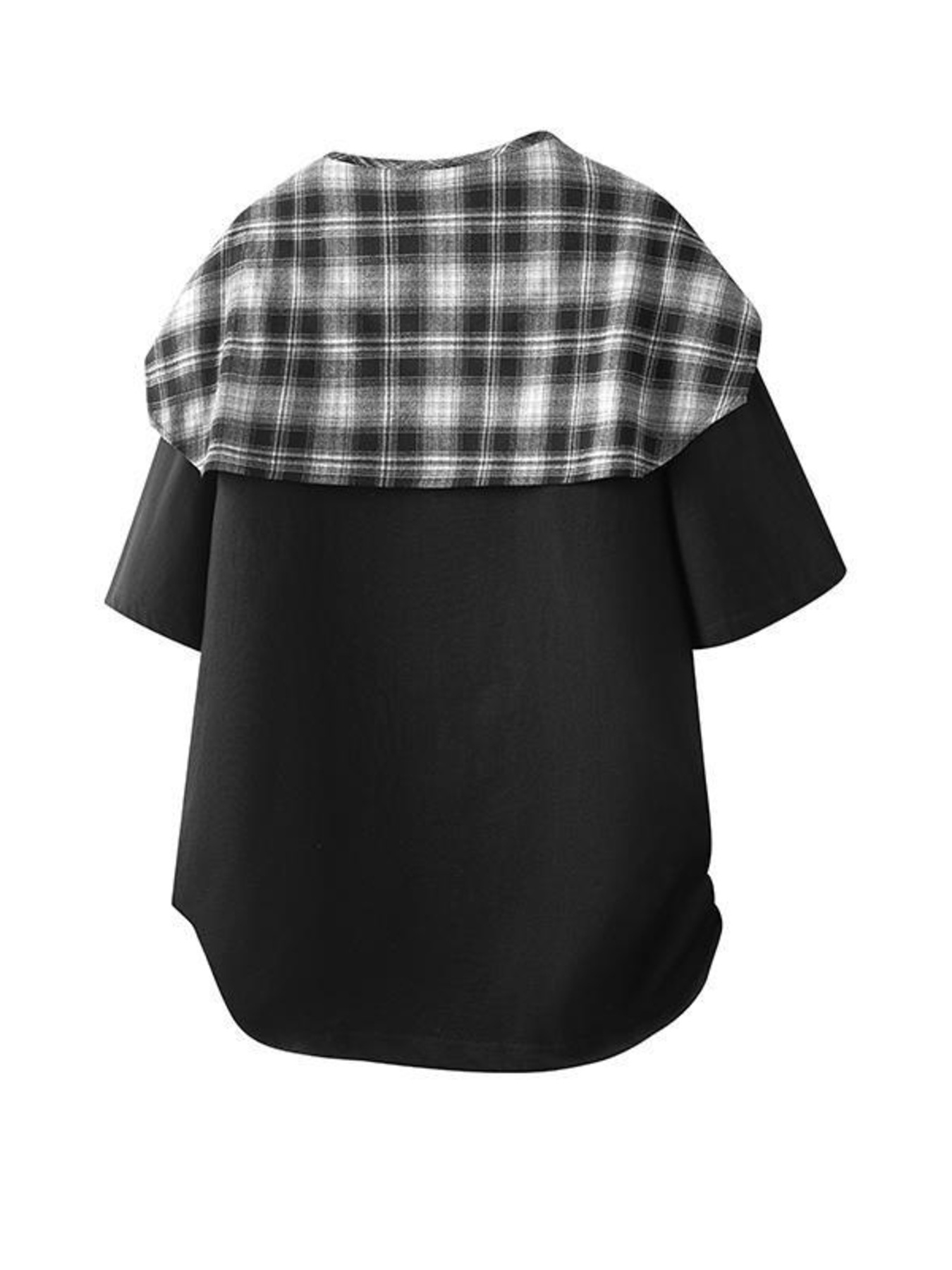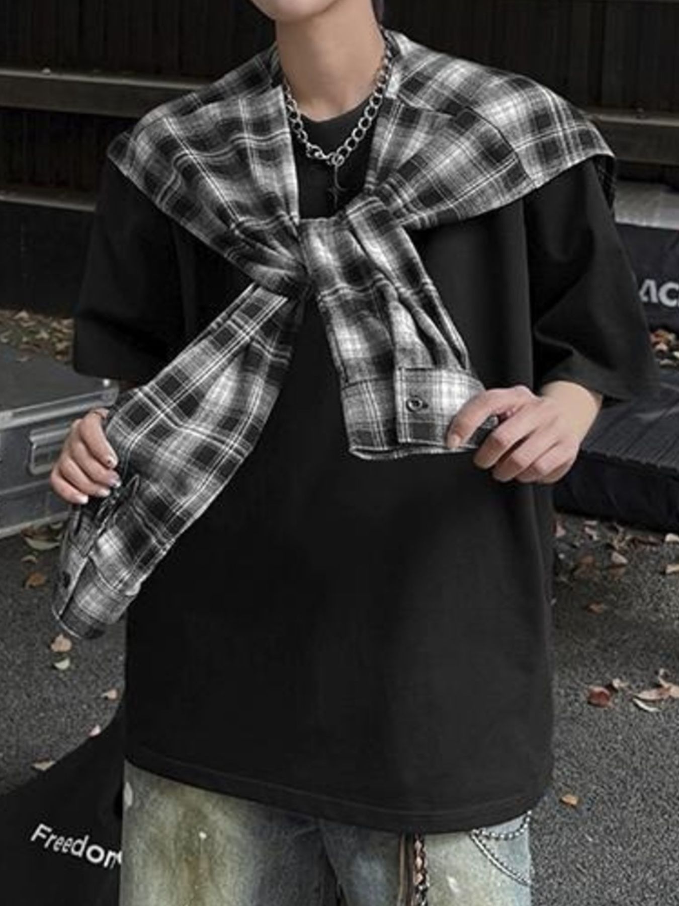 Men's Plus Size Layered Style T-Shirt with Plaid Scarf Detail