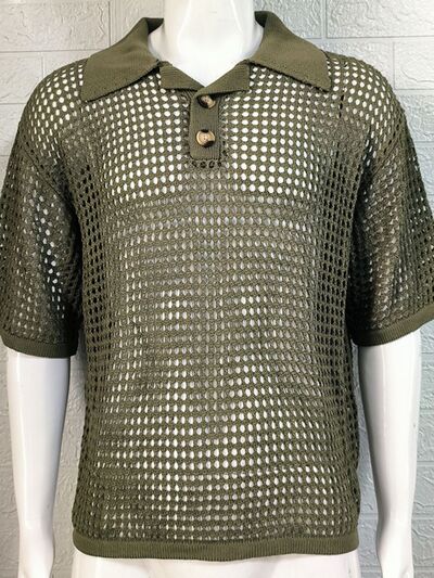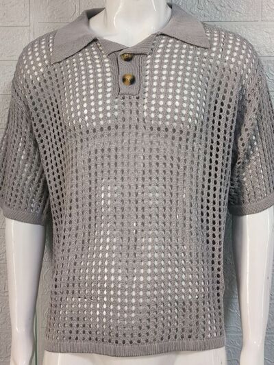 Men's Plus Size Openwork Collared Neck Quarter Button Knit Polo