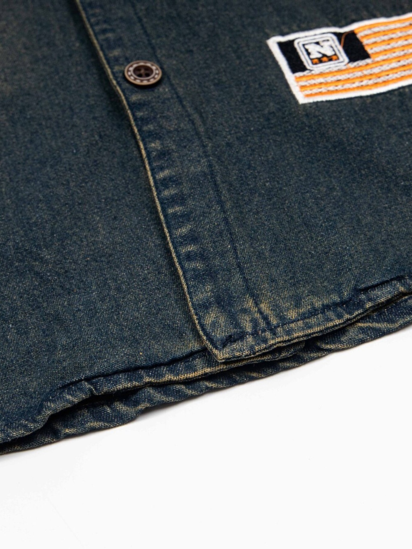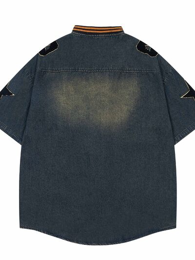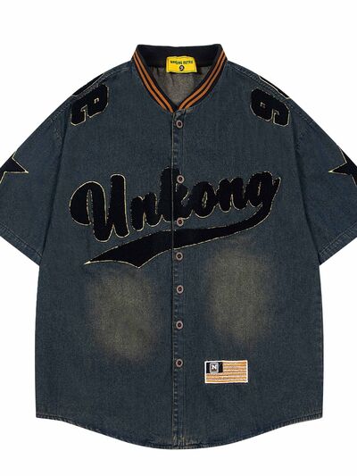 Men's Washed Baseball Collar Denim Shirt with Embroidered Detail