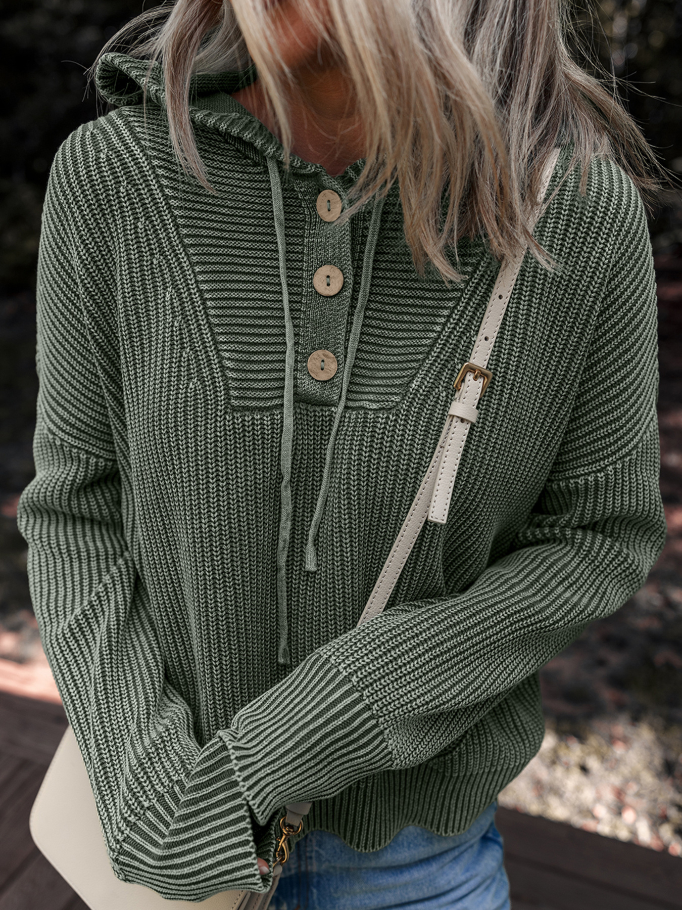 Mineral Wash Ribbed Knit Button Drawstring Neck Hooded Sweater