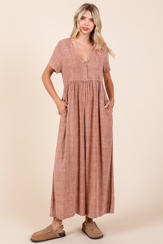 Mineral Wash Short Sleeve Flowy Wide Leg Jumpsuit