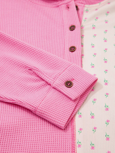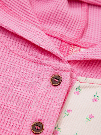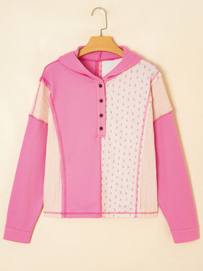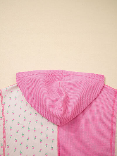 Mixed Texture Waffle Floral Patchwork Hooded Oversize Pullover