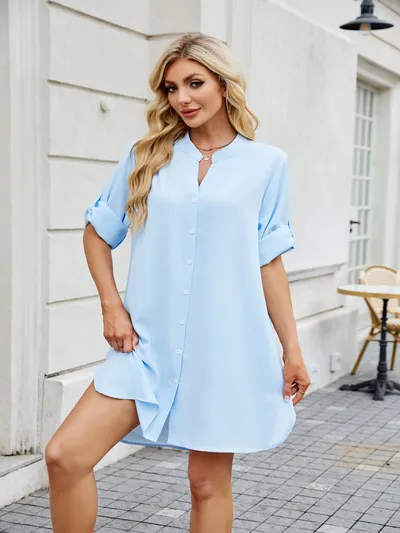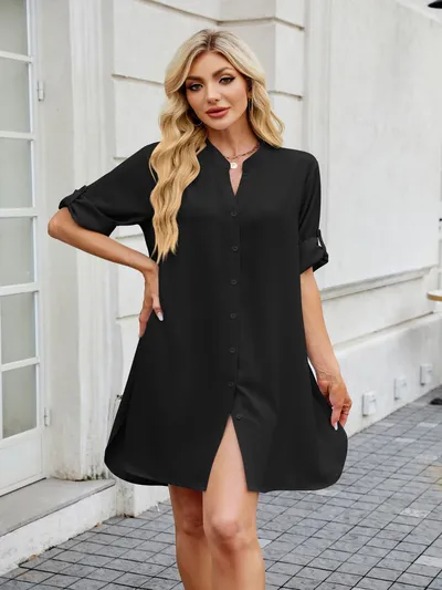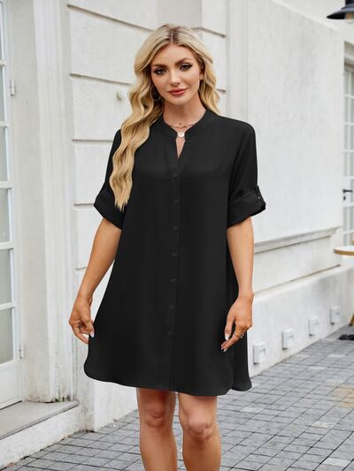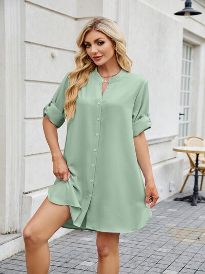 Notched Long Sleeve Mini Shirt Dress