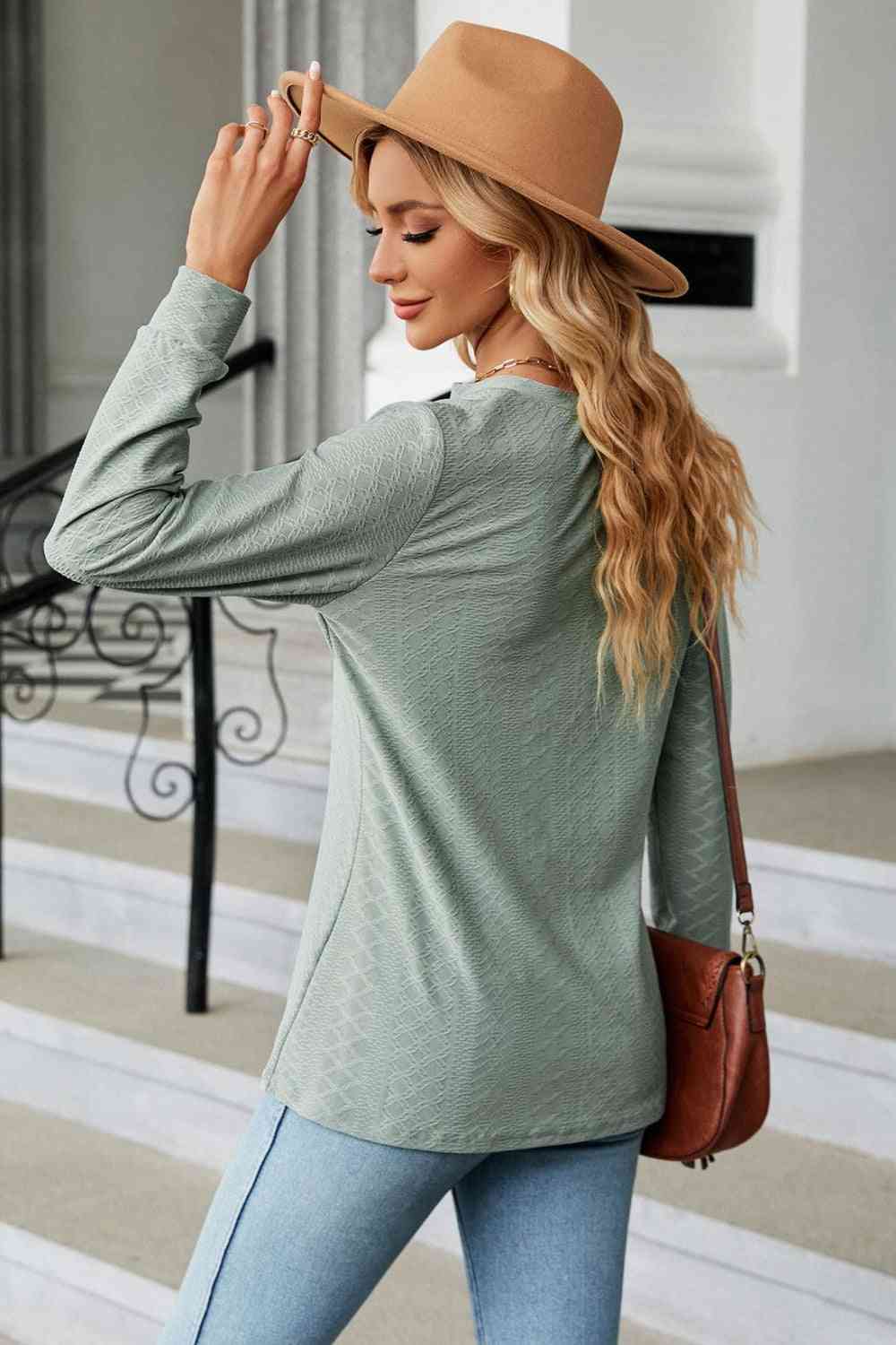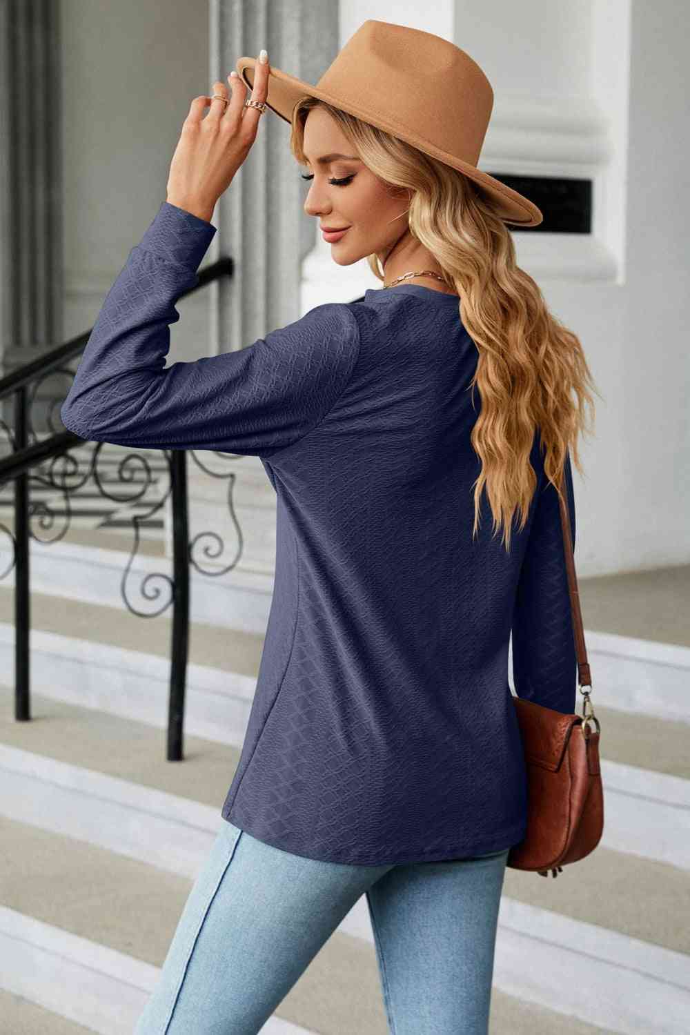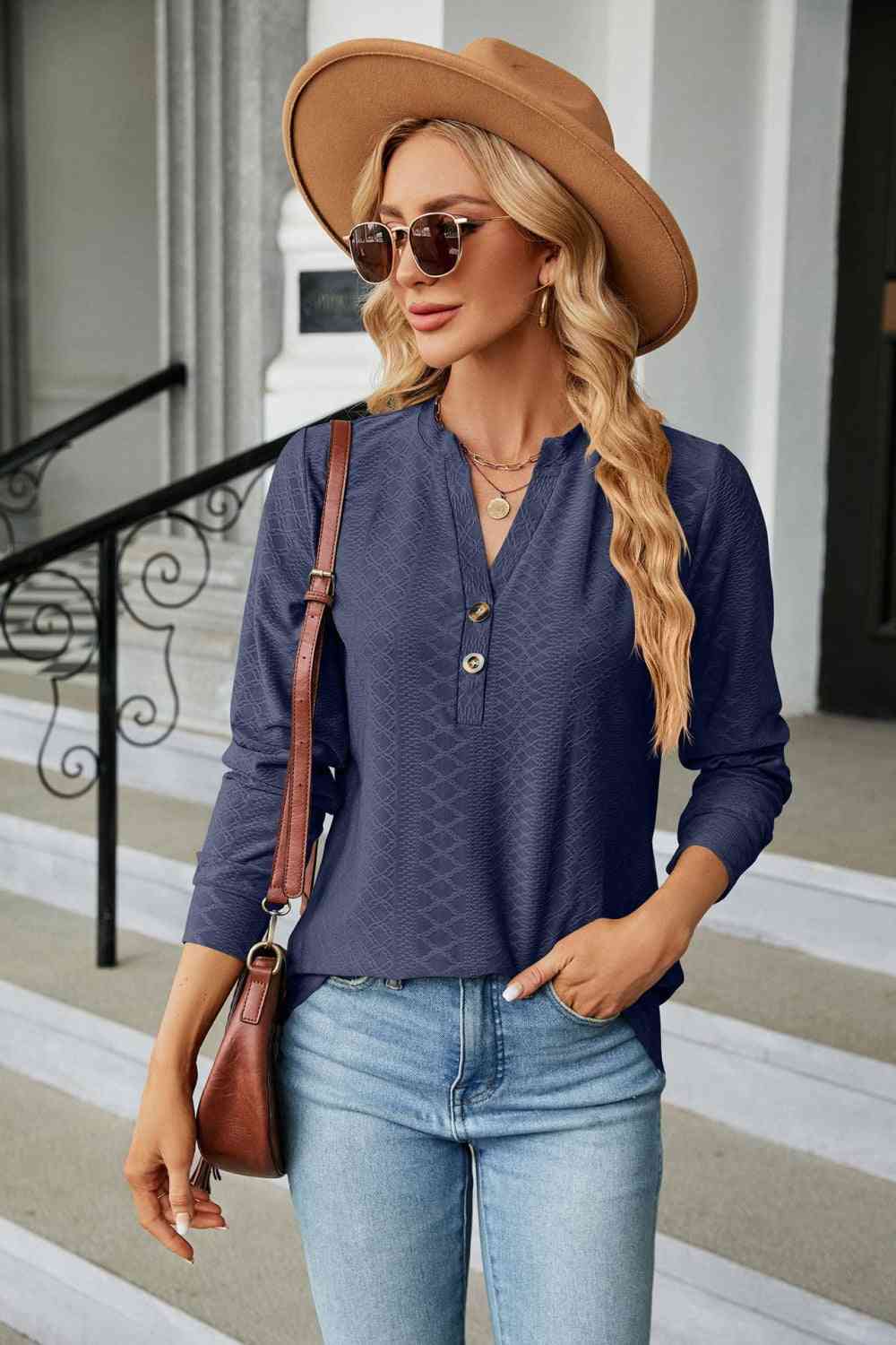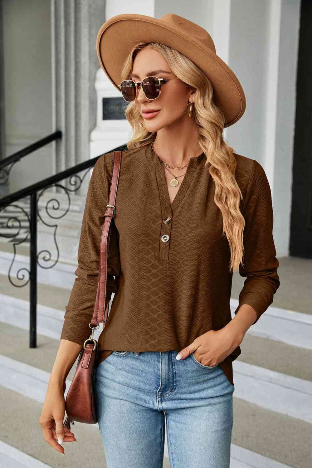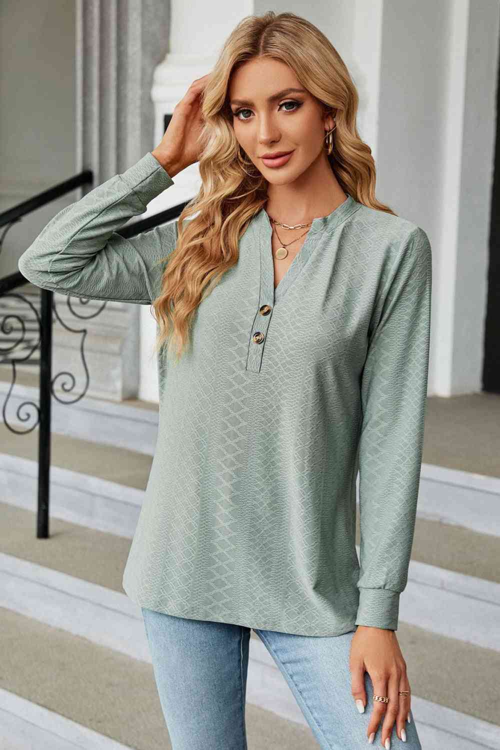 Notched Neck Long Sleeve Buttoned Blouse