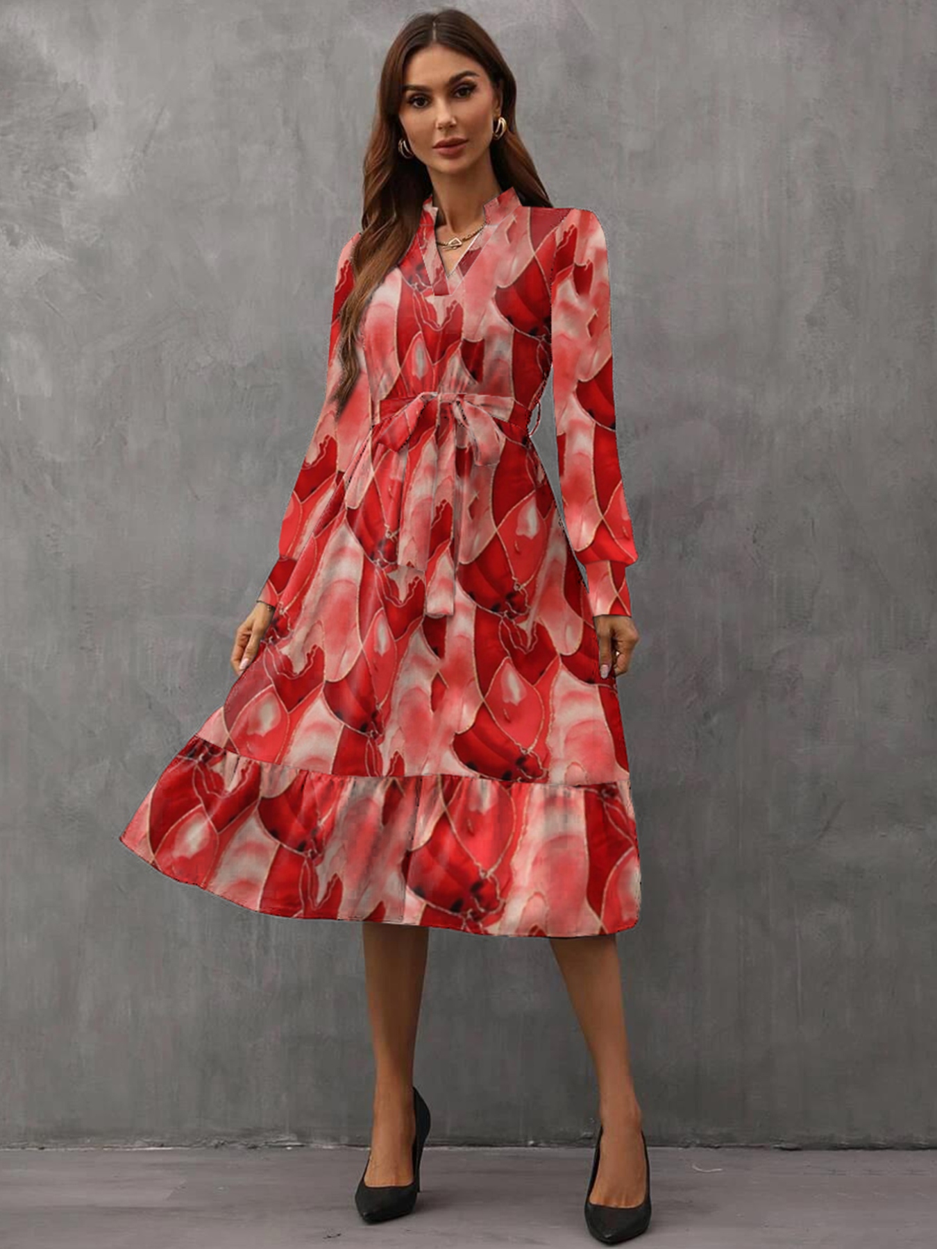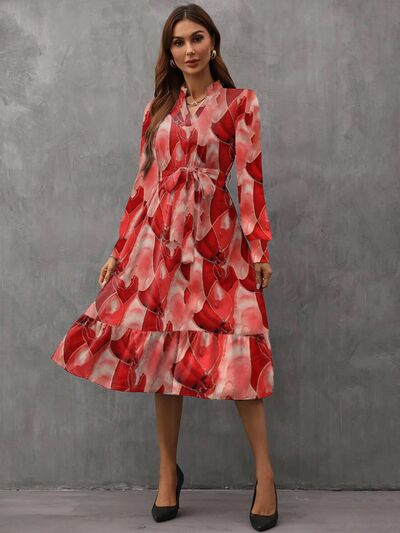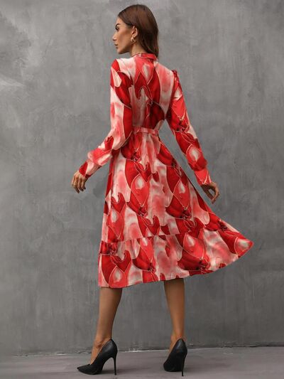 Notched Tie Waist Long Sleeve Dress