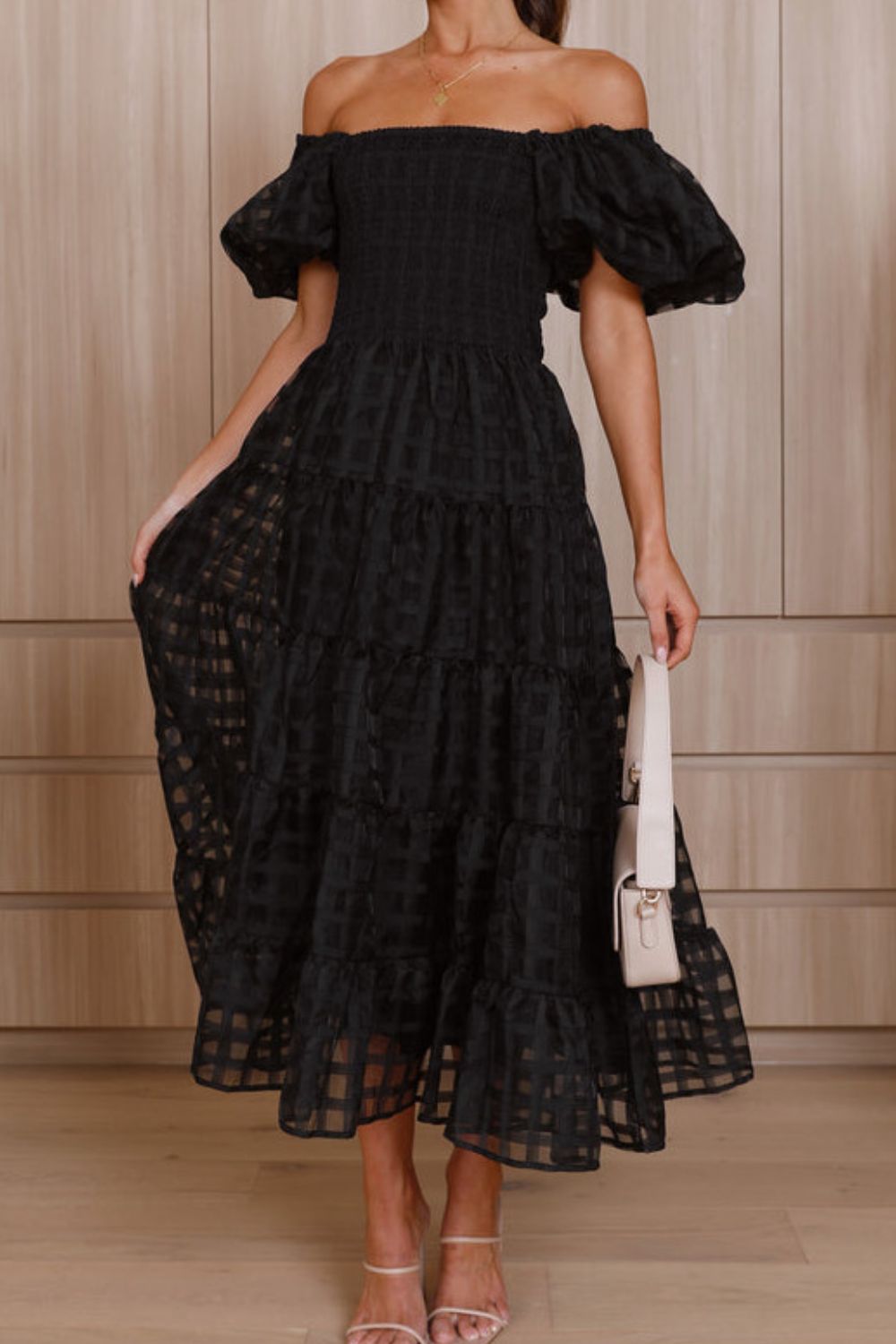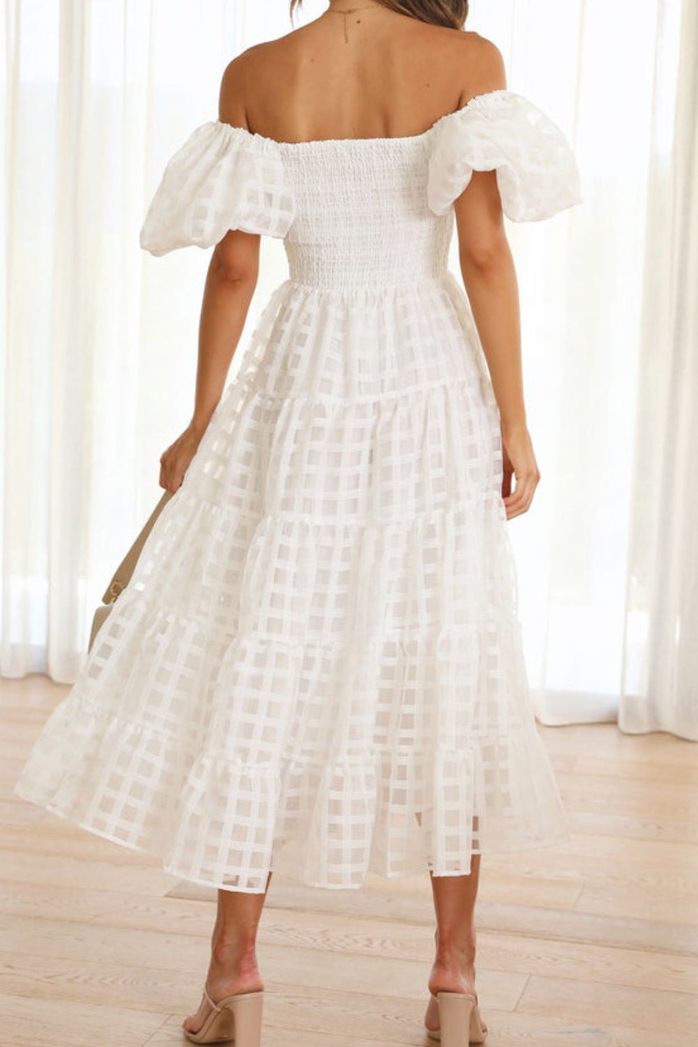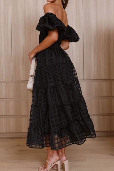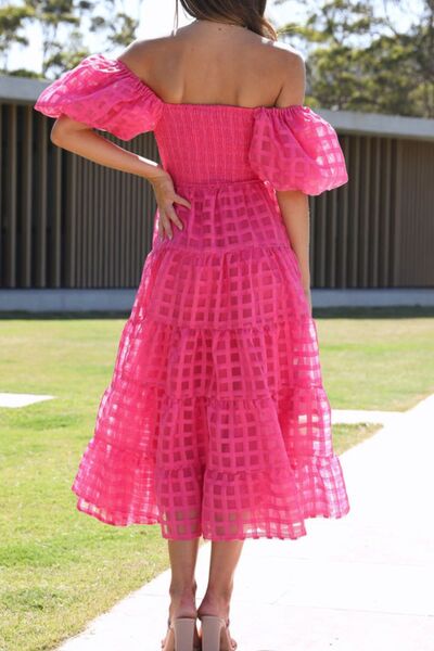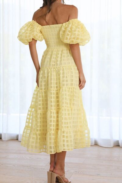 Off Shoulder Short Puff Sleeve Midi Dress
