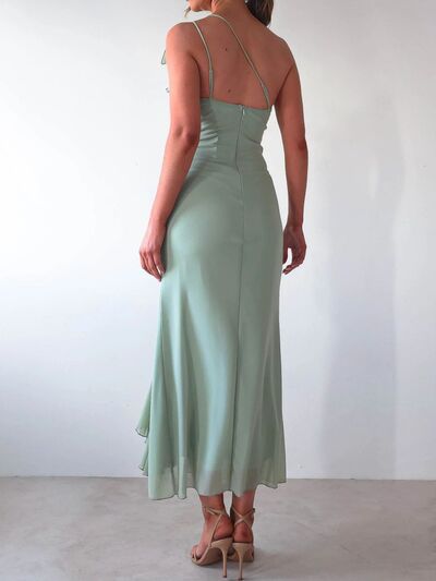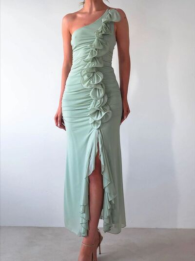 One-Shoulder Ruffle Slit Dress