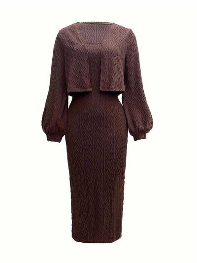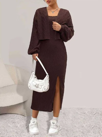 Open Front Long Sleeve Cardigan and Side Slit Cami Dress Set
