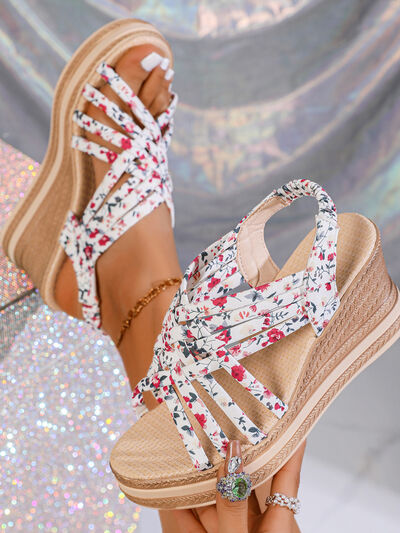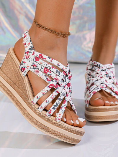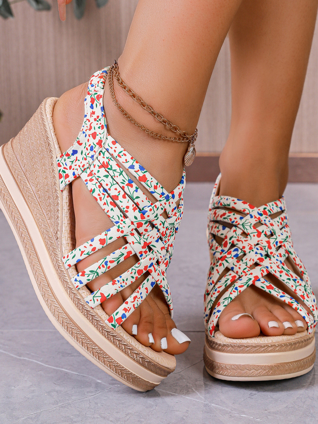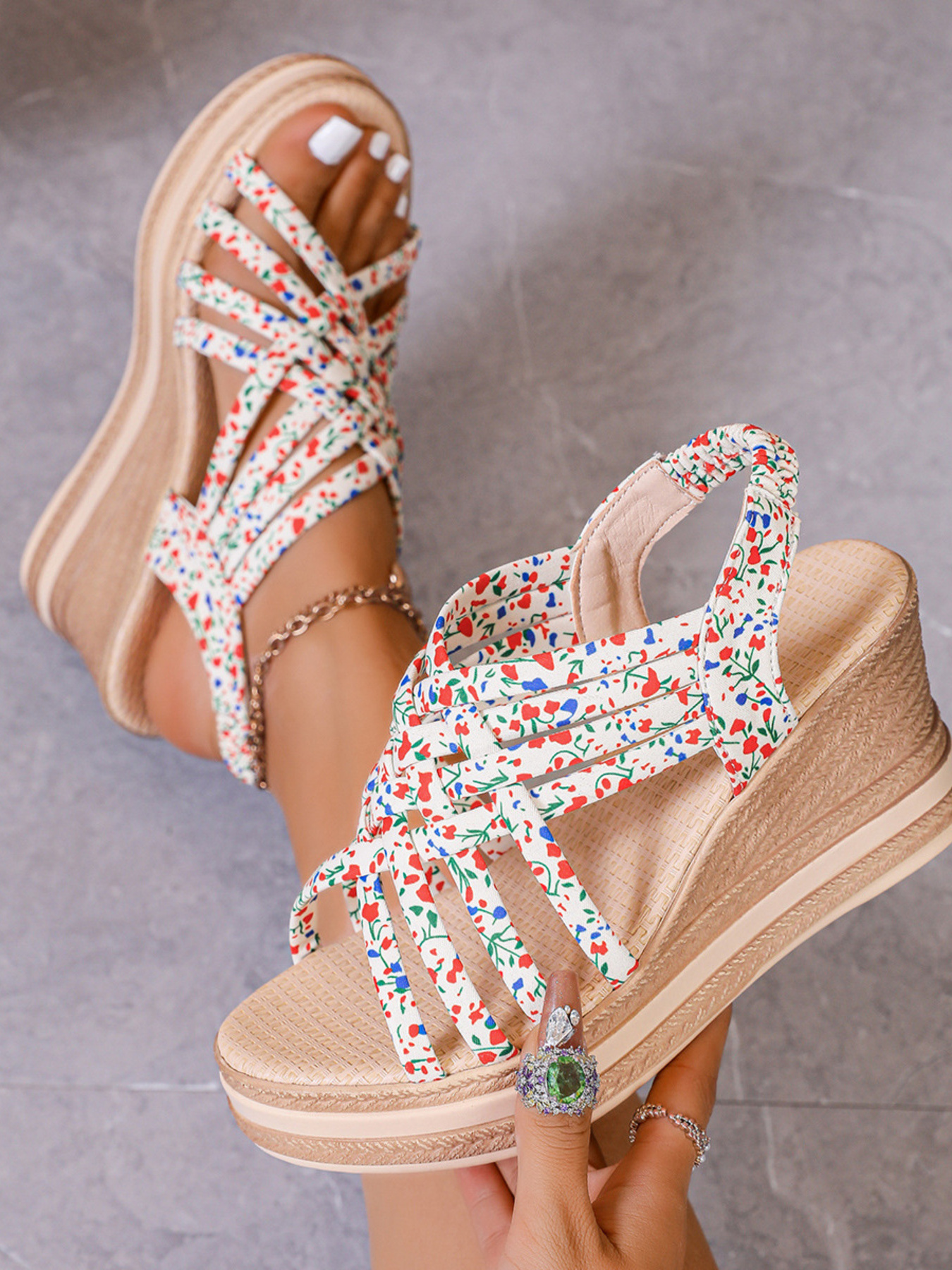 Open Toe Floral Print Strappy Platform Wedge Sandals